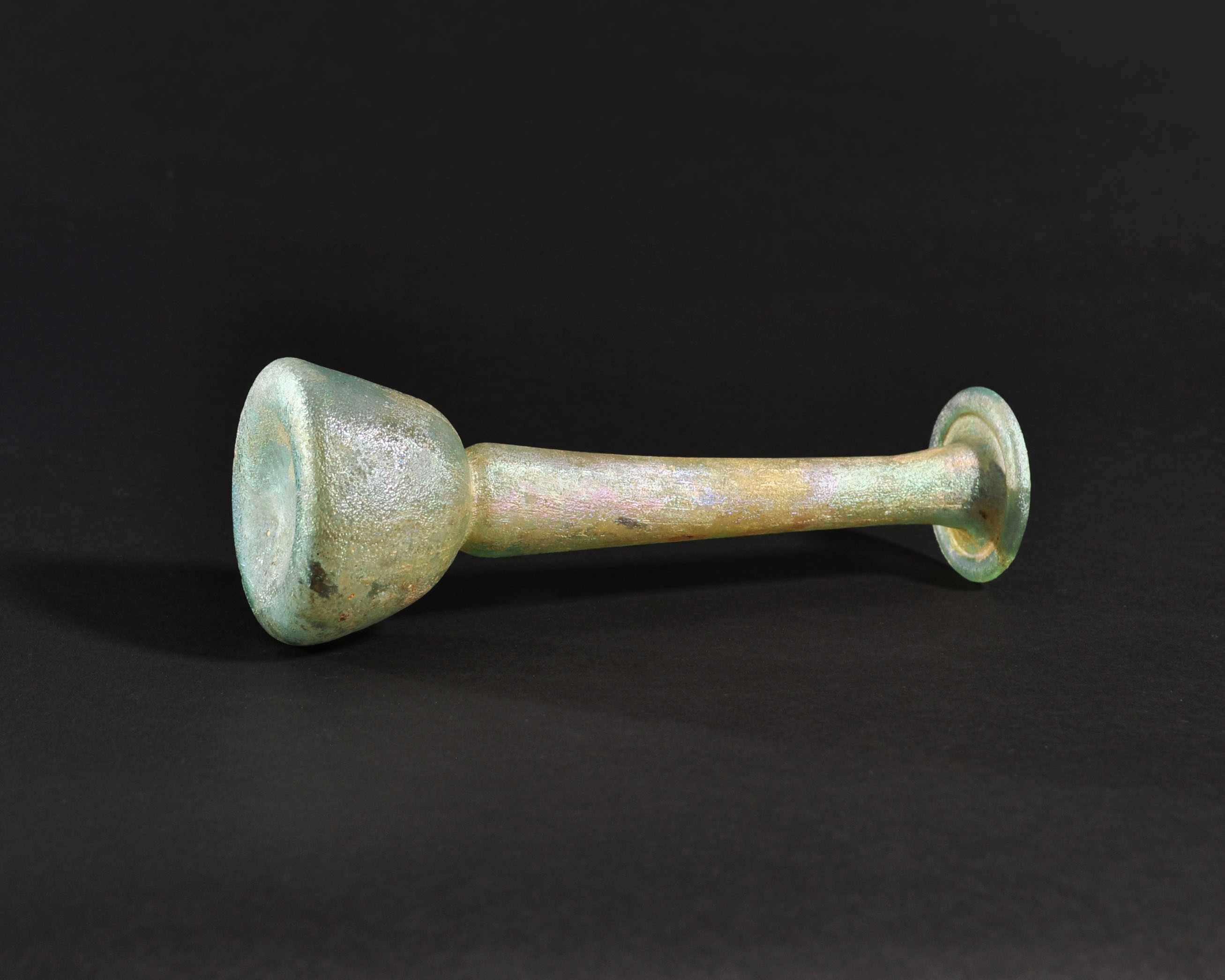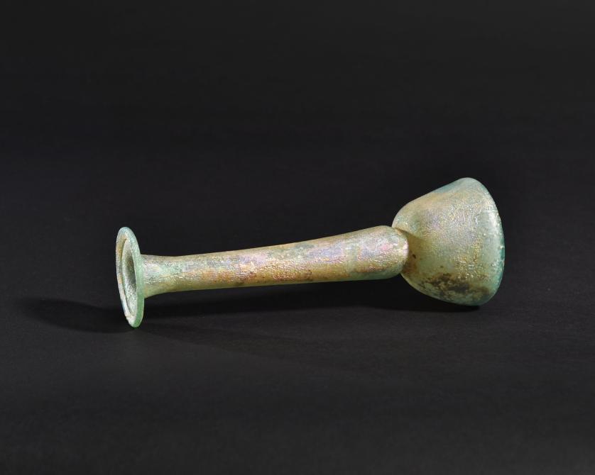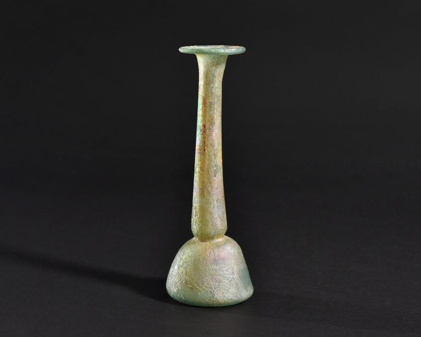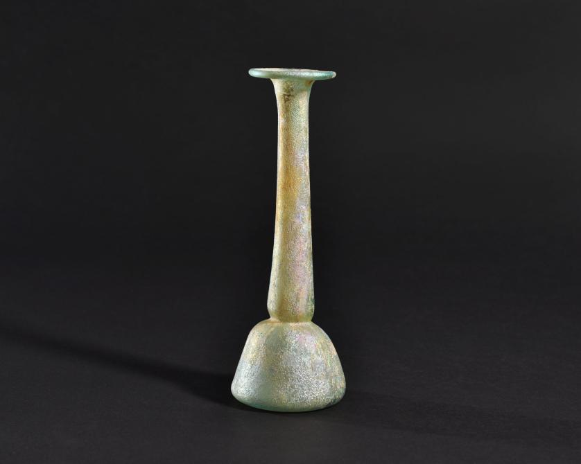 ARQUEOLOGÍA. ROMA. Ungüentario de cuerpo troncocónico, cuello ancho y largo y boca exvasada (ss. I-IV d.C.). Vidrio con irisaciones. Altura 17,5 cm.