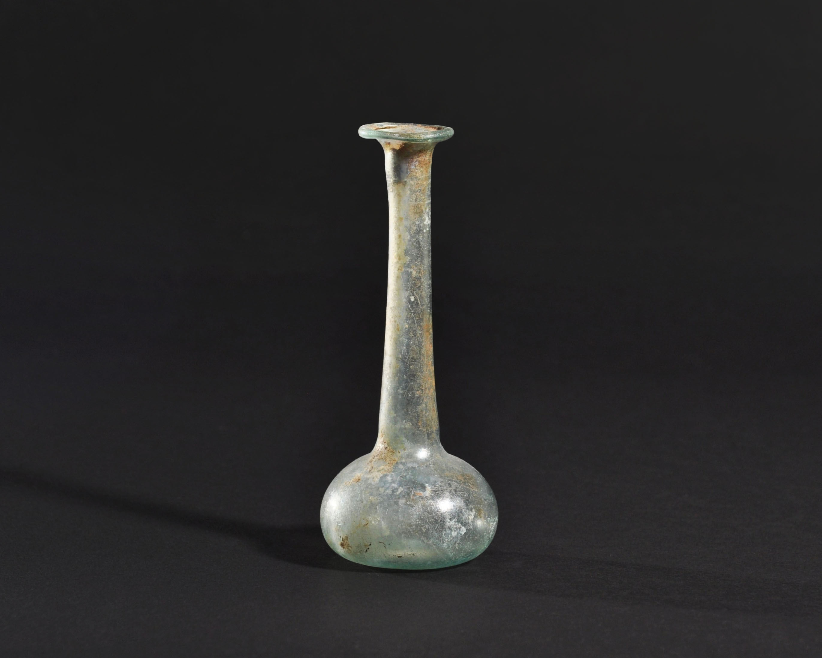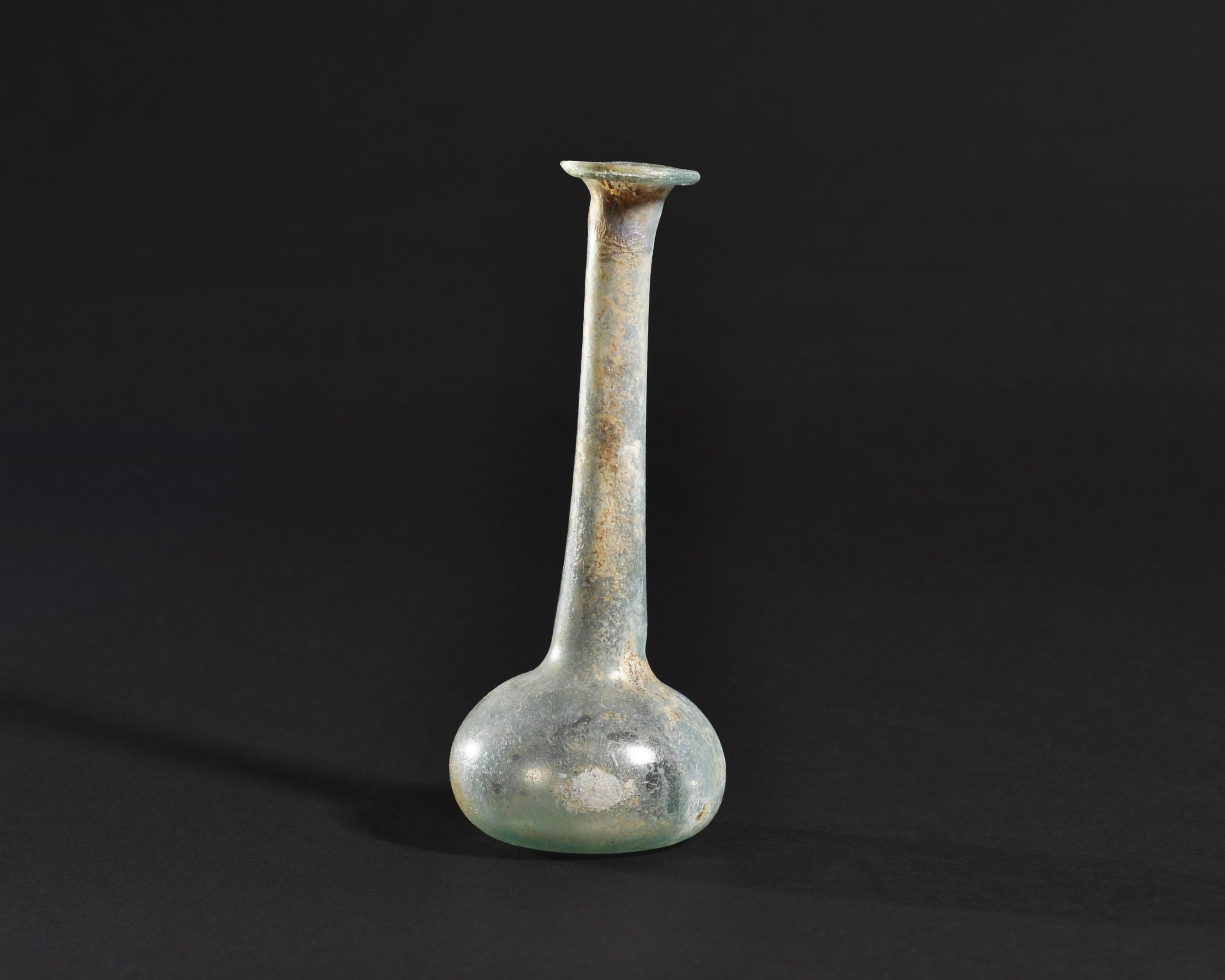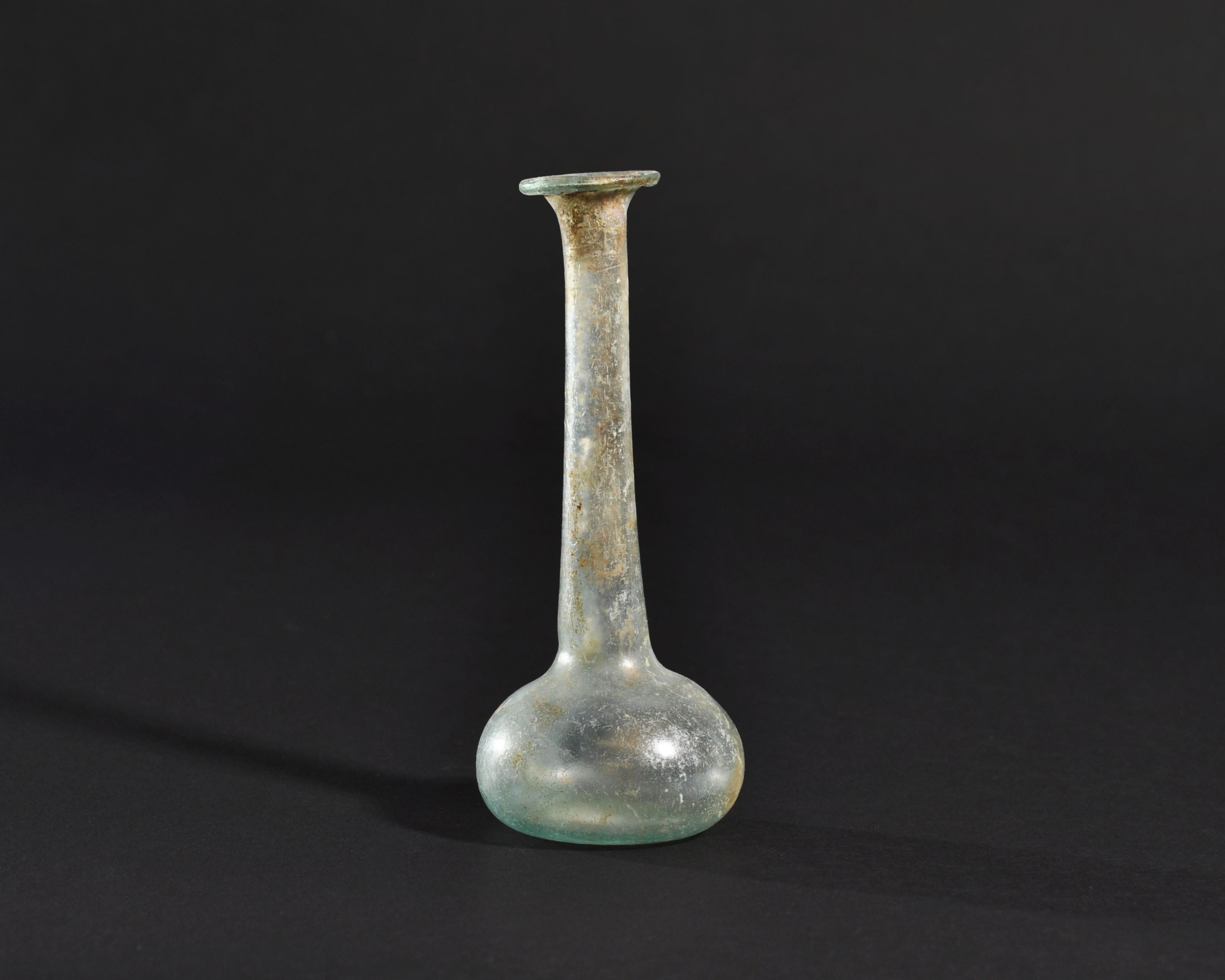 ARQUEOLOGÍA. ROMA. Ungüentario con cuerpo globular achatado, cuello largo y boca exvasada (ss. I-IV d.C.). Vidrio con irisaciones. Altura 12,8 cm.