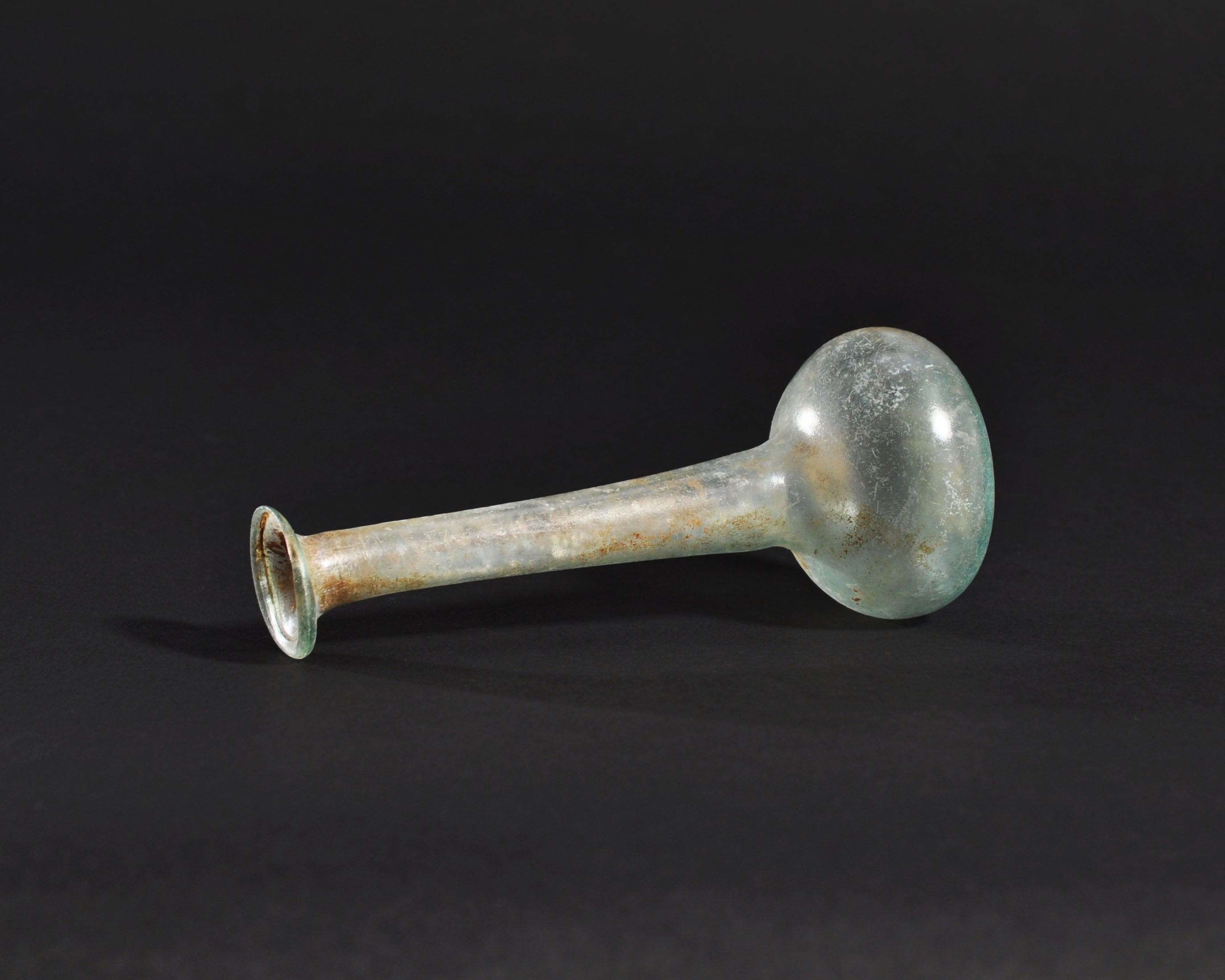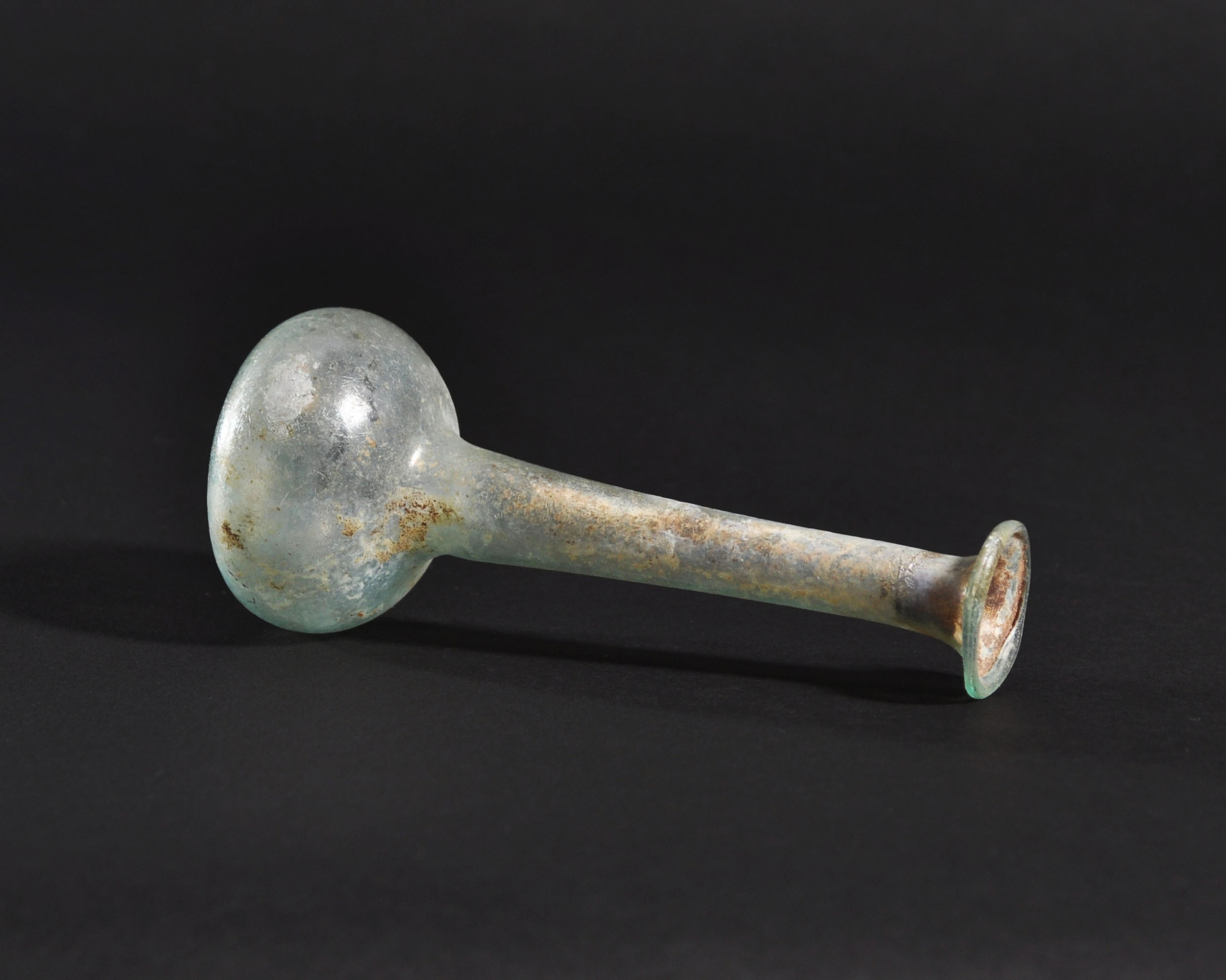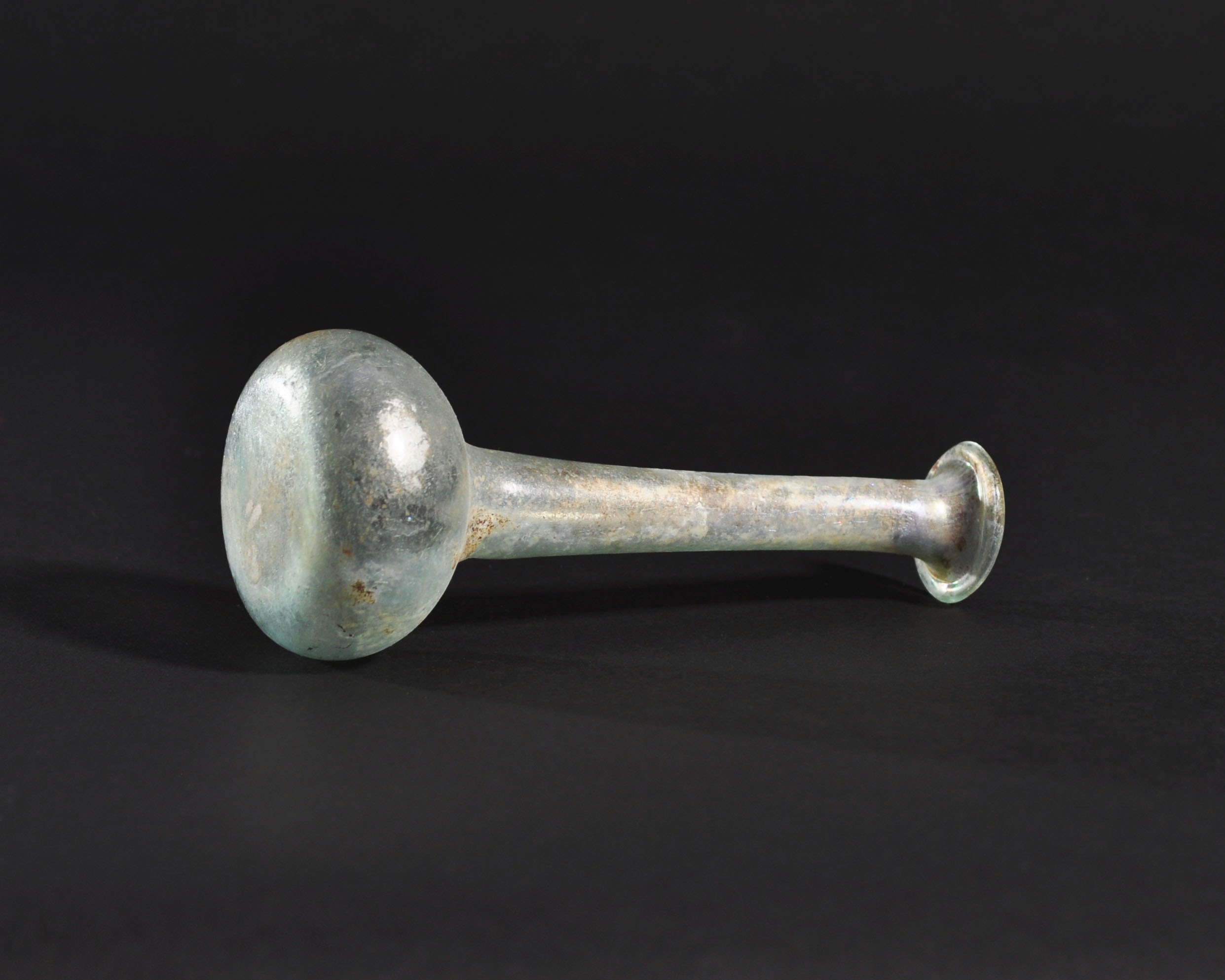 ARQUEOLOGÍA. ROMA. Ungüentario con cuerpo globular achatado, cuello largo y boca exvasada (ss. I-IV d.C.). Vidrio con irisaciones. Altura 12,8 cm.