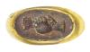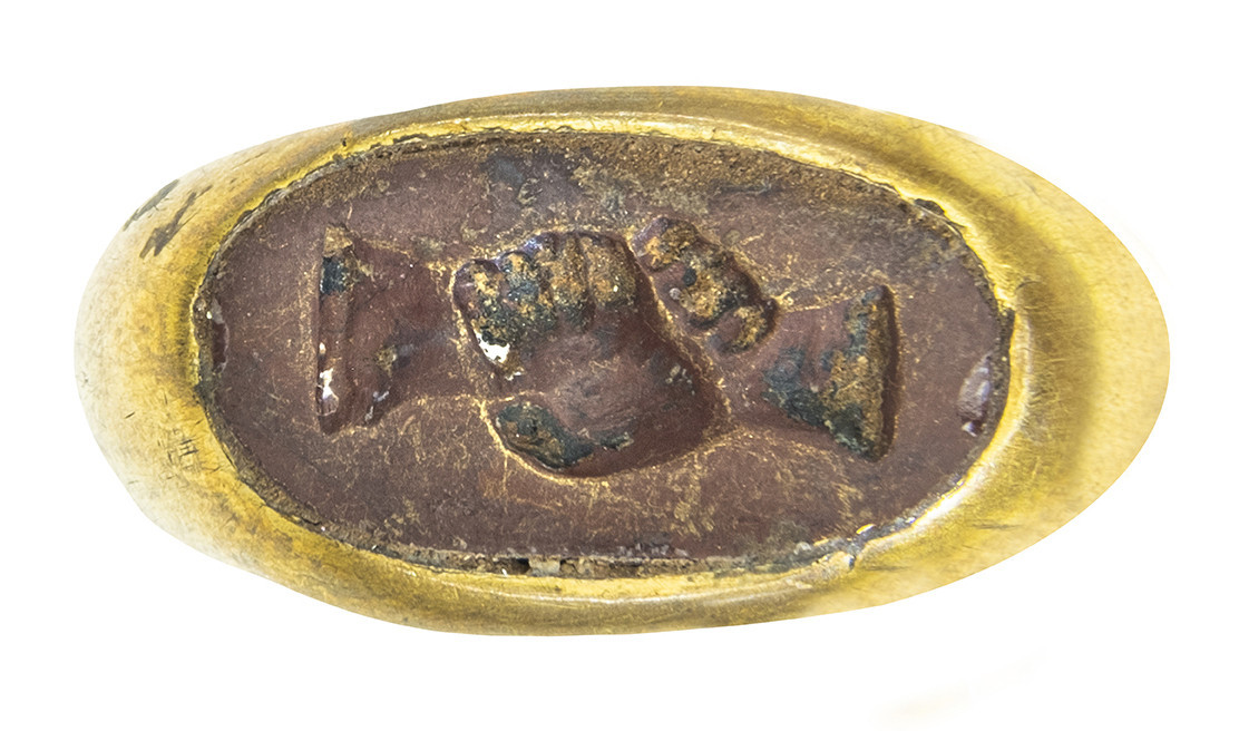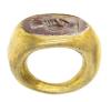 ARQUEOLOGÍA. ROMA. Anillo de aro hueco, con entalle que representa el motivo de dos manos entrelazadas o "dextrarum iunctio" (ss. I-II d.C.). Oro y jaspe rojo. Longitud 29,6 mm. Peso 8,68 gr.