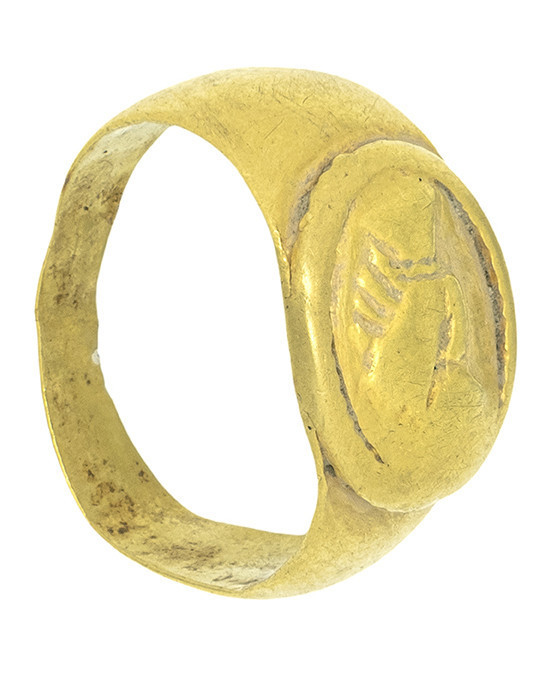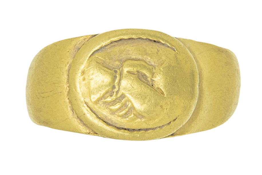 ARQUEOLOGÍA. ROMA. Anillo con chatón ovalado que muestra el motivo de manos entrelazadas o "dextrarum iunctio" rodeado de gráfila de glóbulos (ss. II-III d.C.). Oro. Longitud 18,2 mm. Peso 5,47 gr.
