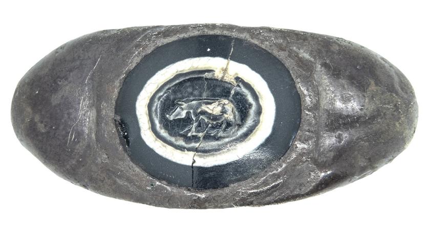 ARQUEOLOGÍA. ROMA. Anillo de aro grueso con hombros muy marcados y más fino en su parte inferior, que lleva un entalle tronco elíptico en el que se representa una cerda (ss. III-IV d.C.). Plata y ágata bandeada. Longitud 32,8 mm. Peso 18,58 gr.