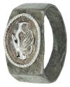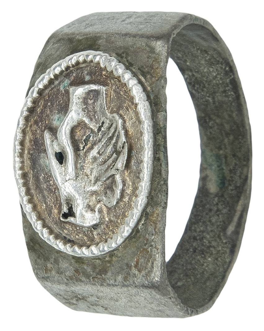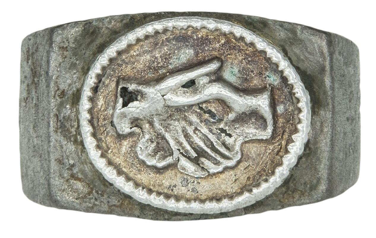 ARQUEOLOGÍA. ROMA. Anillo de aro facetado, con un engaste metálico con la representación de manos estrechadas o "dextrarum iunctio" (ss. III-V d.C.). Plata. Longitud 22,1 mm. Peso 4,72 gr.