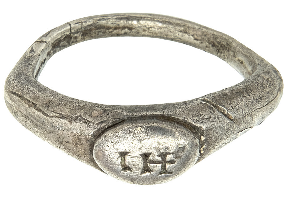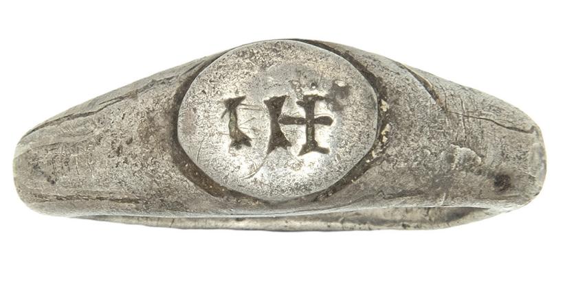 ARQUEOLOGÍA. ROMA. Anillo con hombros marcados y chatón con la inscripción IHE (siglo III d.C.). Plata. Longitud 22,8 mm. Peso 5,14 gr.