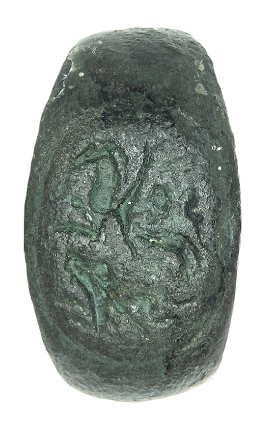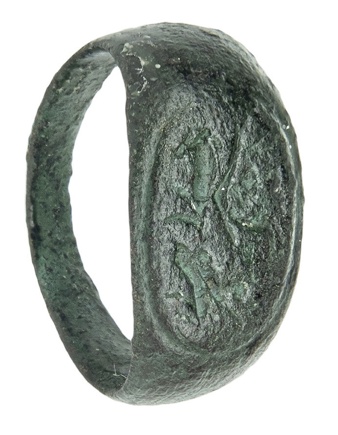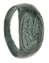 ARQUEOLOGÍA. ROMA. Anillo con aro liso, plano, engrosado en su parte superior, donde presenta un sello ovalado con el grabado de un pegaso volando a izq. y debajo un león (¿siglo II d.C.?). Bronce. Longitud 22,1 mm. Peso 5,25 gr.