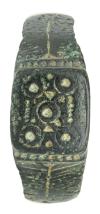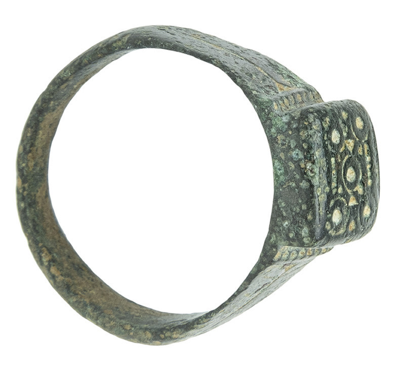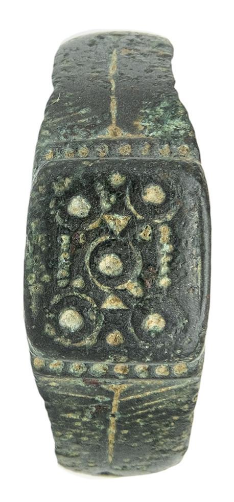 ARQUEOLOGÍA. VISIGODOS. Anillo de hombros decorados con incisiones en forma de espina de pez y chatón cuadrado con decoración grabada de círculos concéntricos, triángulos y otros motivos geométricos (ss. VI-VIII d.C.). Bronce. Longitud 23,4 mm. Peso 6,84 gr.