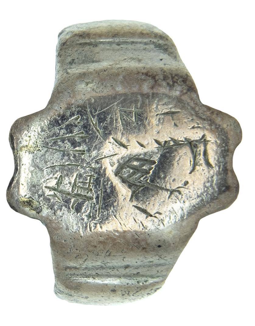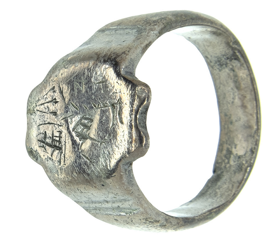 ARQUEOLOGÍA. EDAD MEDIA. Anillo posiblemente procedente de los Balcanes, de aro con hombros marcados que presentan restos de decoración incisa y un sello polilobulado en el que se representa un motivo heráldico, formado por un lobo esquemático con las fauces abiertas sobre un escudo, acompañado de otros signos sin identificar (siglo XV). Plata. Longitud 24,1 mm. Peso 10,44 gr.