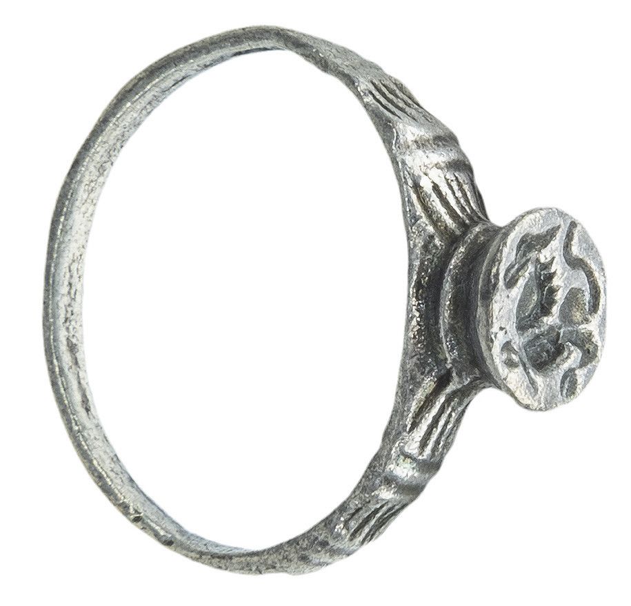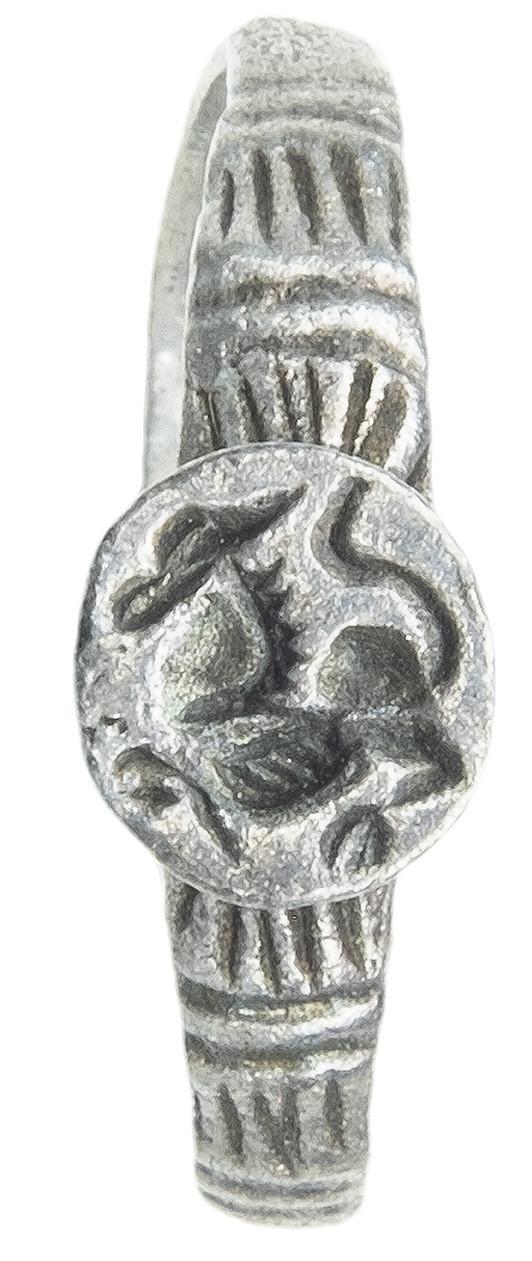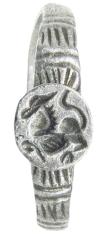 ARQUEOLOGÍA. EDAD MEDIA. Anillo-sello tardo-medieval, posiblemente de los Balcanes. El aro está decorado con grupos de líneas incisas y presenta un chatón circular en el que aparece grabado un lobo a izq. (ca. s. XV). Plata. Longitud 15,9 mm. Peso 1,43 gr.