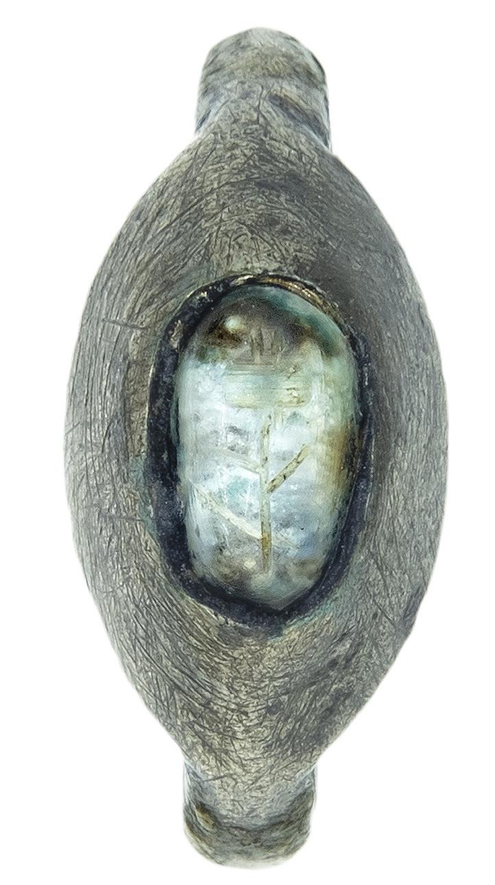 ARQUEOLOGÍA. MUNDO ISLÁMICO. ¿Irán? Anillo posiblemente oriental de época medieval o moderna, formado por un aro liso y una cazoleta tronco-elíptica con un entalle ovalado en el que se distingue una flor muy esquemática, probablemente una amapola (post. s. IX). Plata y cristal de roca. Longitud 20,5 mm. Peso 5,49 gr.