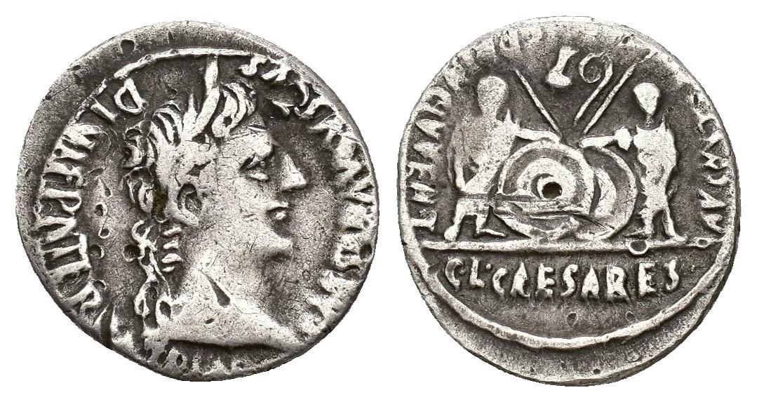 PERIODO DE JULIO CÉSAR A AUGUSTO. AUGUSTO. Denario. Lugdunum (2 a.C.-4 d.C.). A/ Cabeza laureada a der. R/ Cayo y Lucio, encima símpulo a izq. hacia la der. y lituus a der. hacia la izq.; escudo izq. sobre der. AR 3,50 g. 19,2 mm. RIC-207. FFC-22. Golpecitos en anv. y rayas en rev. BC+.