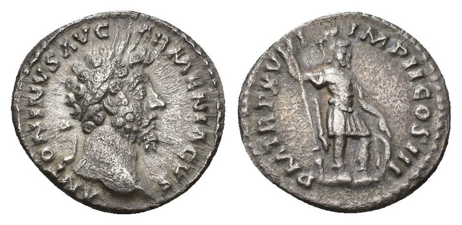 IMPERIO ROMANO. MARCO AURELIO. Denario. Roma (163-164). A/ Cabeza laureada a der.; ANTONINVS AVG ARMENIACVS. R/ Marte a der. con escudo y lanza; P M TR P XVIII IMP II COS III. AR 3,38 g. 17,3 mm. RIC-91. MBC.