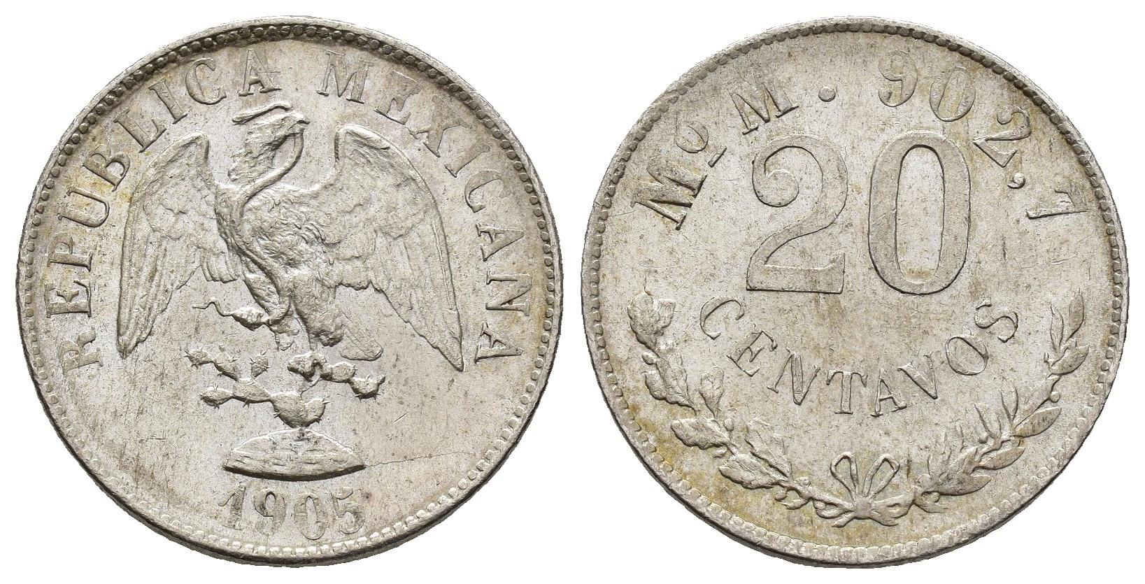 MONEDAS EXTRANJERAS. MÉXICO. 20 centavos. 1905. MO M. AR 5,42 g. 22,1 mm. KM-405. 2. Pequeñas marcas. EBC+.