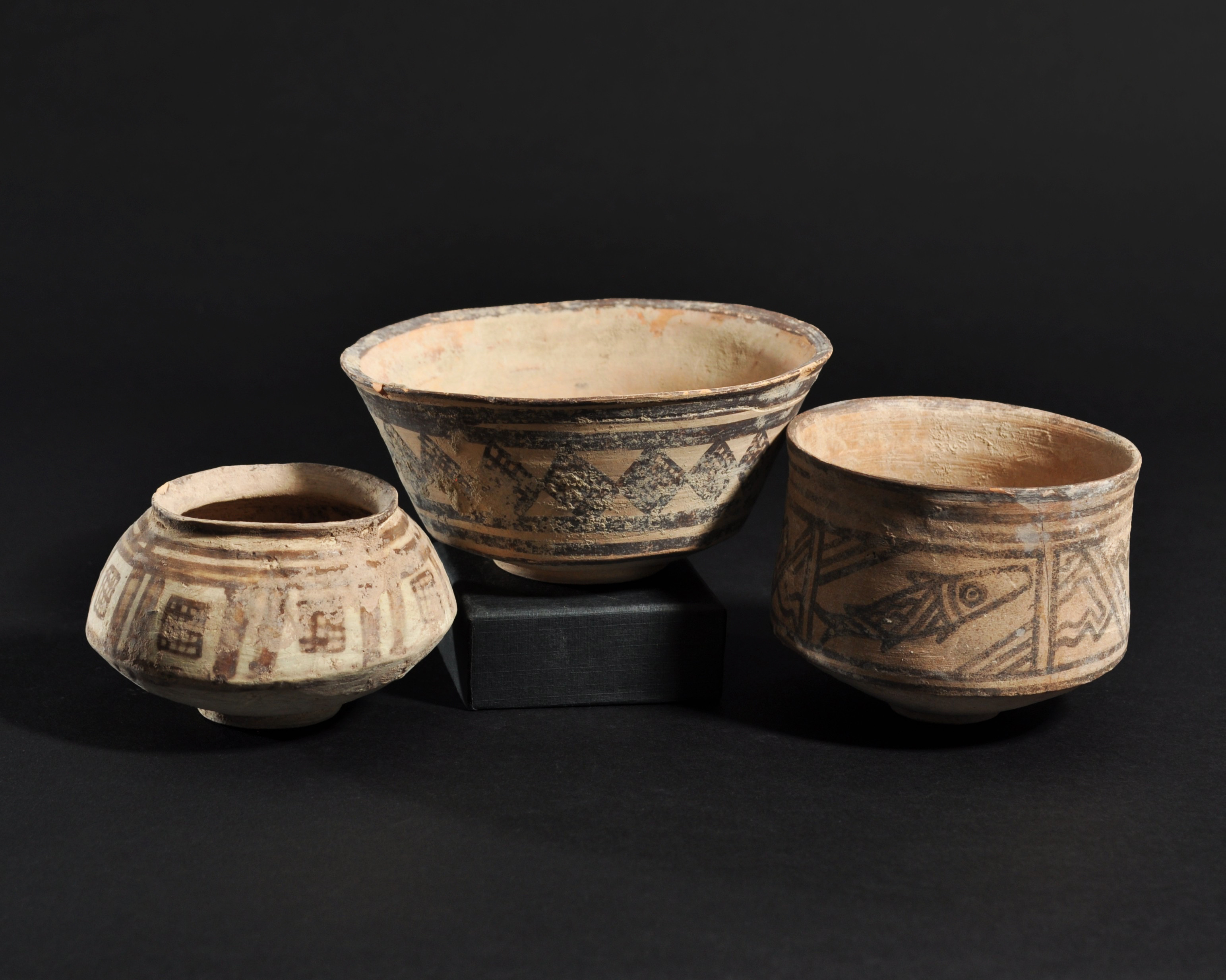 ARQUEOLOGÍA. MEDIO ORIENTE. Valle del Indo. Lote de 3 cuencos con decoración geométrica y, uno de ellos, con decoración zoomorfa (III-II milenio a.C.). Cerámica. Altura de 5 a 6,5 cm. Uno de ellos fragmentado y restaurado.