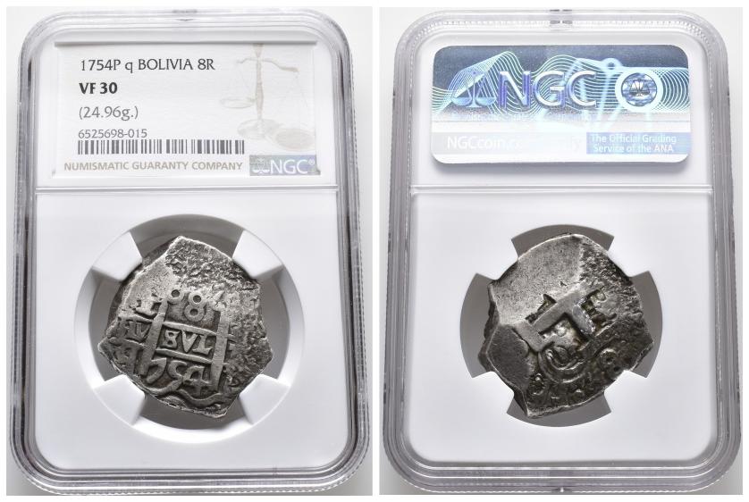 FERNANDO VI. 8 reales. 1754 Potosí. q. AR.VI-383; AC-531. Encapsulada NGC-VF 30. Vanos. MBC-.