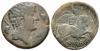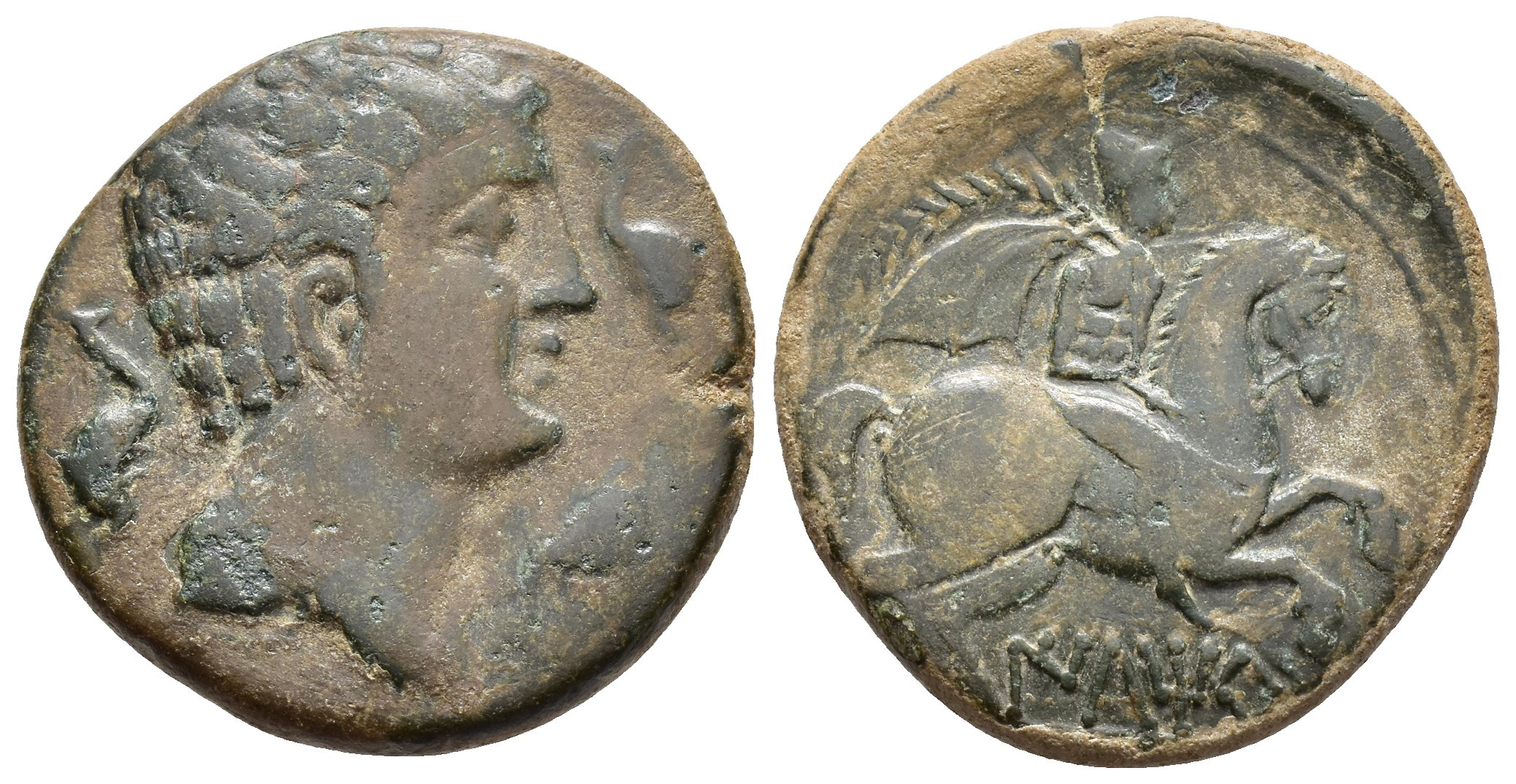 HISPANIA ANTIGUA. ILTIRTA. Unidad. A/ Cabeza masculina a der., alrededor 3 delfines. R/ Jinete con clámide y palma a der., debajo sobre línea ILTiRTa. AE 13,2 g. 28 mm. I-1465; ACIP-1251. Pátina verde. MBC-/MBC.