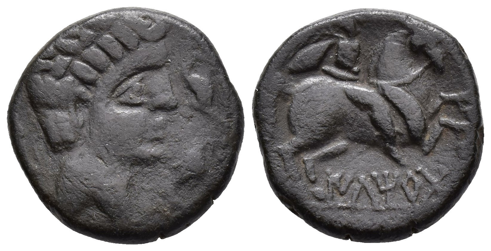 HISPANIA ANTIGUA. ILTIRTA. As. A/ Cabeza masculina a der., alrededor tres delfines. R/ Jinete con palma y clámide a der., debajo sobre línea ILTiRTa. AE 9,1 g. 21,8 mm. I-1466. ACIP-1256. Pátina oscura. MBC-/MBC. Escasa.