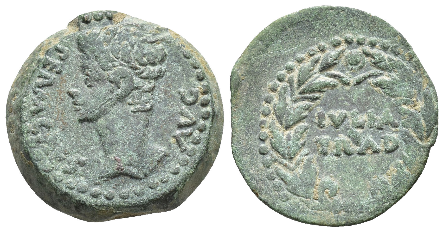 HISPANIA ANTIGUA. IULIA TRADUCTA. As. Augusto A/ Cabeza a izq.; PERM CAES AVG. R/ Corona cívica rodeando IVLIA/ TRAD. AE 11,02 g. 25,3 mm. I-1614; APRH-108; ACIP-3352. Pátina verde. MBC.