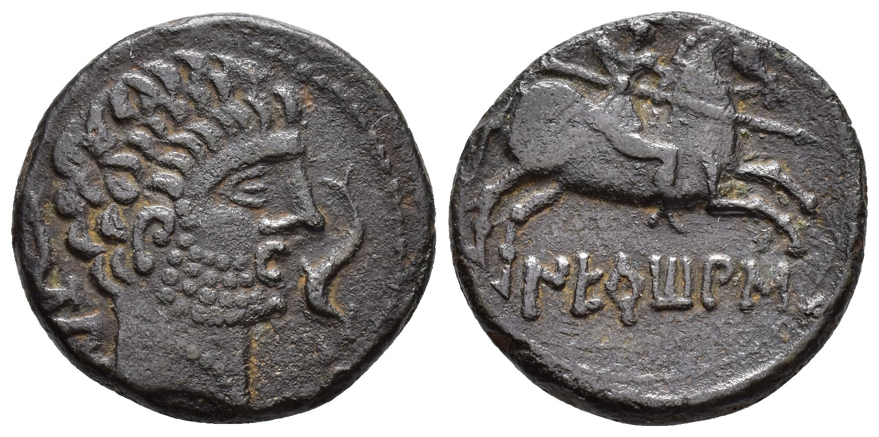 HISPANIA ANTIGUA. NERTOBIS. Unidad. A/ Cabeza masculina con collar a der., delante delfín, detrás delfín y signo ibérico N. R/ Jinete lancero a der., debajo sobre línea NERToBIS. AE 7,7 g. 22,8 mm. I-1772; ACIP-1603. Pátina oscura. MBC. Muy escasa.