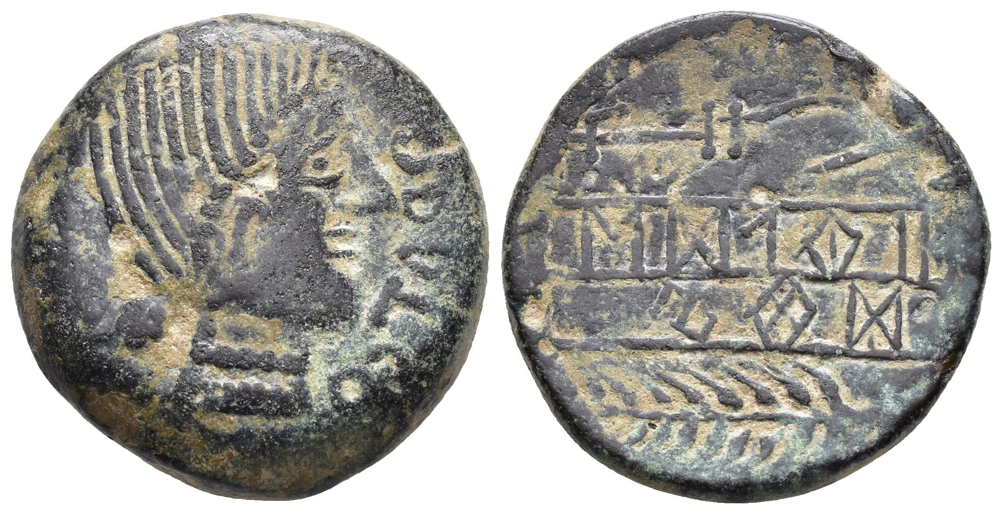 HISPANIA ANTIGUA. OBULCO. Unidad. A/ Cabeza femenina con moño a der. dentro de láurea; OBVLCO. R/ Arado y espiga con aspa a der., en medio BoTiLKoS/TiKuEKi. AE 22,06 g. 27,06 mm. I-1794; ACIP-2209. Pátina verde. MBC-. Rara.