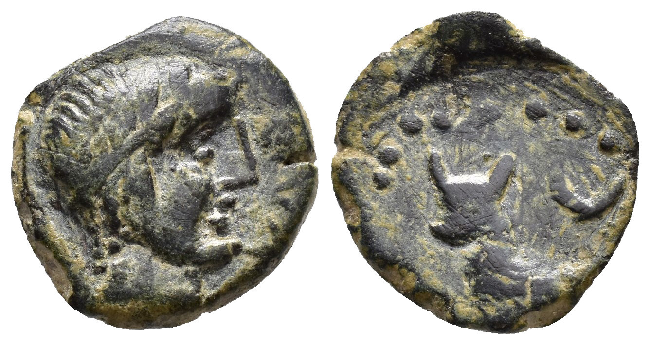 HISPANIA ANTIGUA. OBULCO. Semis. A/ Cabeza de Apolo a der., delante OBVLCO. R/ Toro a izq., encima creciente. AE 4,32 g. 17,6 mm. I-no; ACIP-2258 vte. CC-2907, mismo ejemplar. Rev. descentrado. Pátina verde. MBC/BC+. Muy rara.