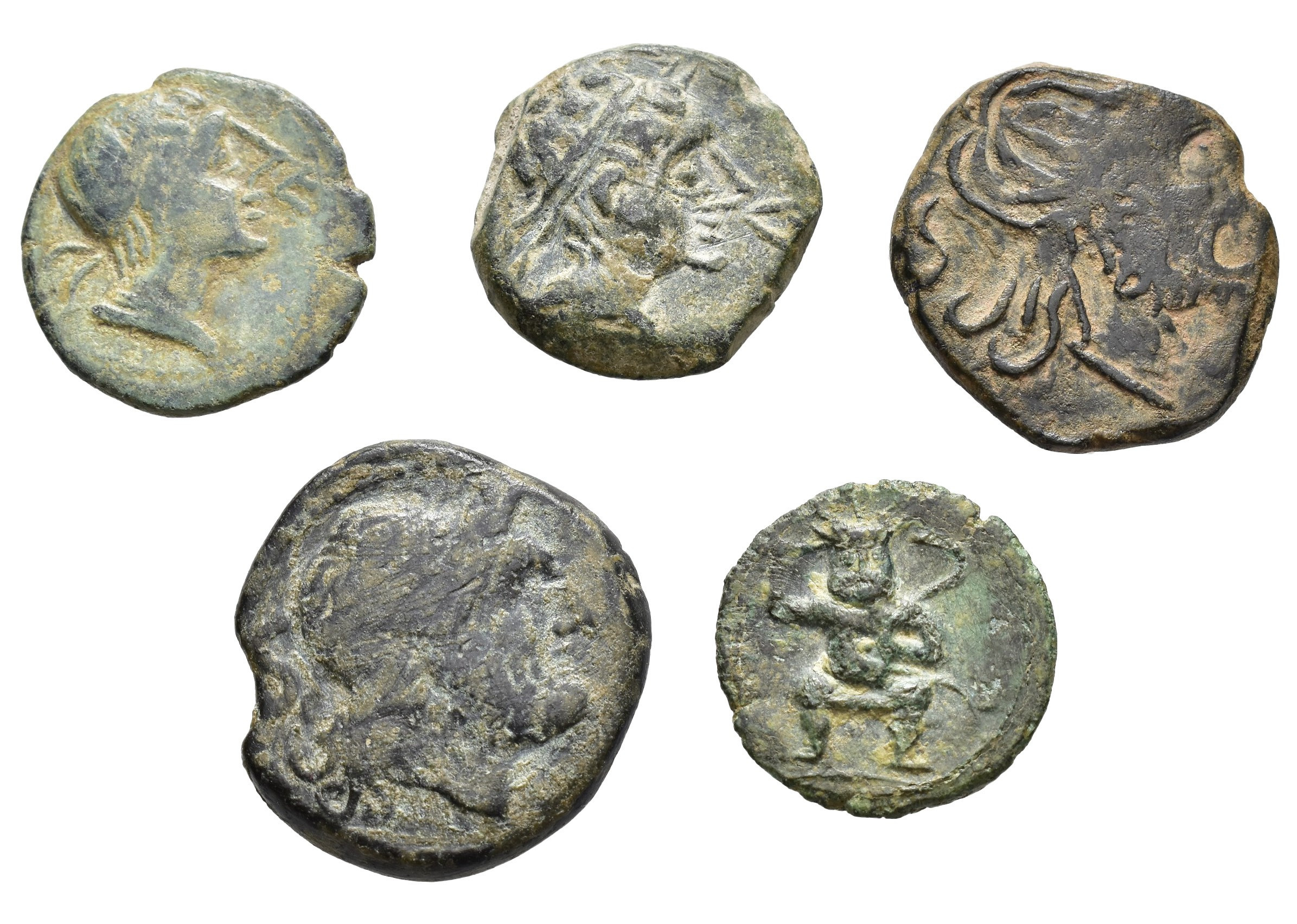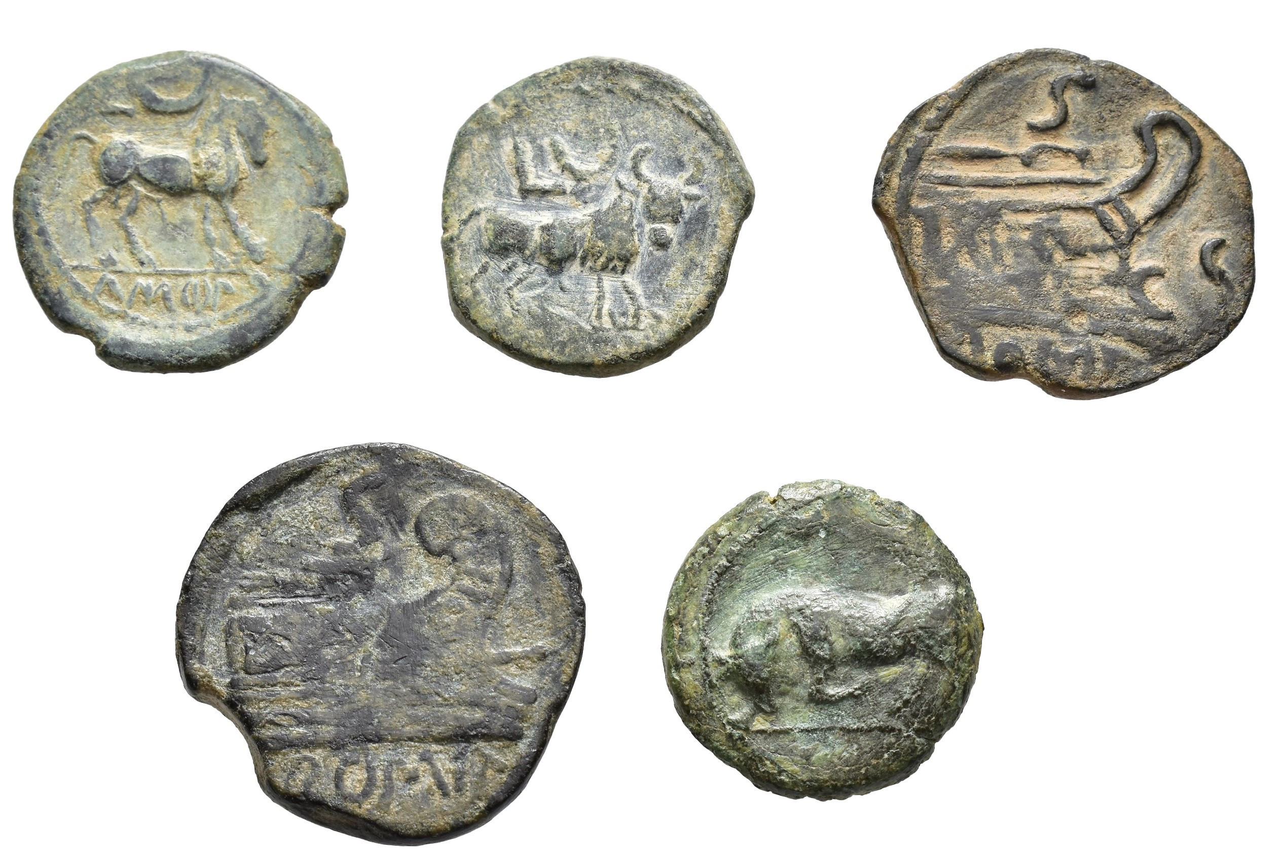 HISPANIA ANTIGUA. Lote de 5 piezas: 3 monedas de Hispania antigua y 2 semis romano-republicanos. BC+/MBC.