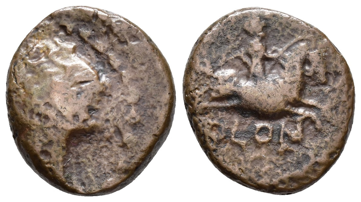HISPANIA ANTIGUA. OLONTIGI. Unidad. A/ Cabeza masculina a der. R/ Jinete a der., debajo OLONT. AE 7,47 g. mm. I-1876. ACIP-860. Anv. descentrado. Erosiones. BC/BC+. Rara.