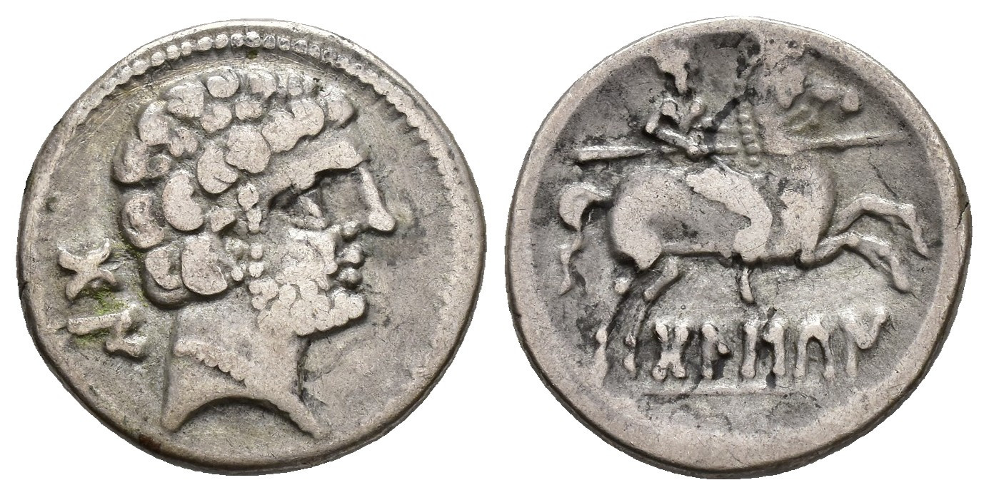 HISPANIA ANTIGUA. BOLSKAN. Denario. A/ Cabeza masculina a der., detrás BoN. R/ Jinete con lanza a der., debajo sobre línea BoLSKaN. AR 3,94 g. 18 mm. I-1911; ACIP-1413. MBC-.