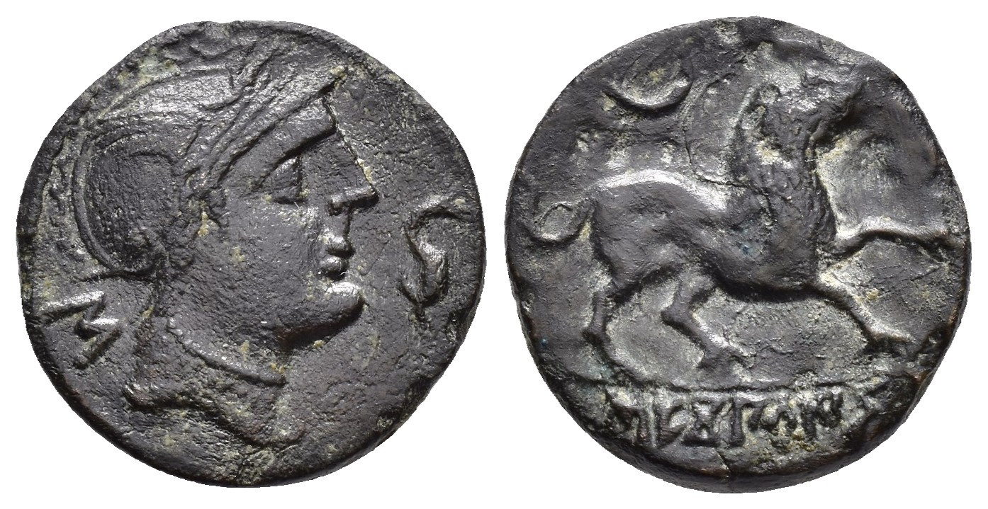 HISPANIA ANTIGUA. SEKOBIRIKES. Mitad. A/ Cabeza femenina con casco a der., delante delfín, detrás signo ibérico S. R/ León a der., encima creciente, en exergo SEKoBiRIKeS. AE 4,2 g. 18,6 mm. I-2180. ACIP-1877. Pátina verde oscuro. MBC+. Muy escasa.
