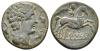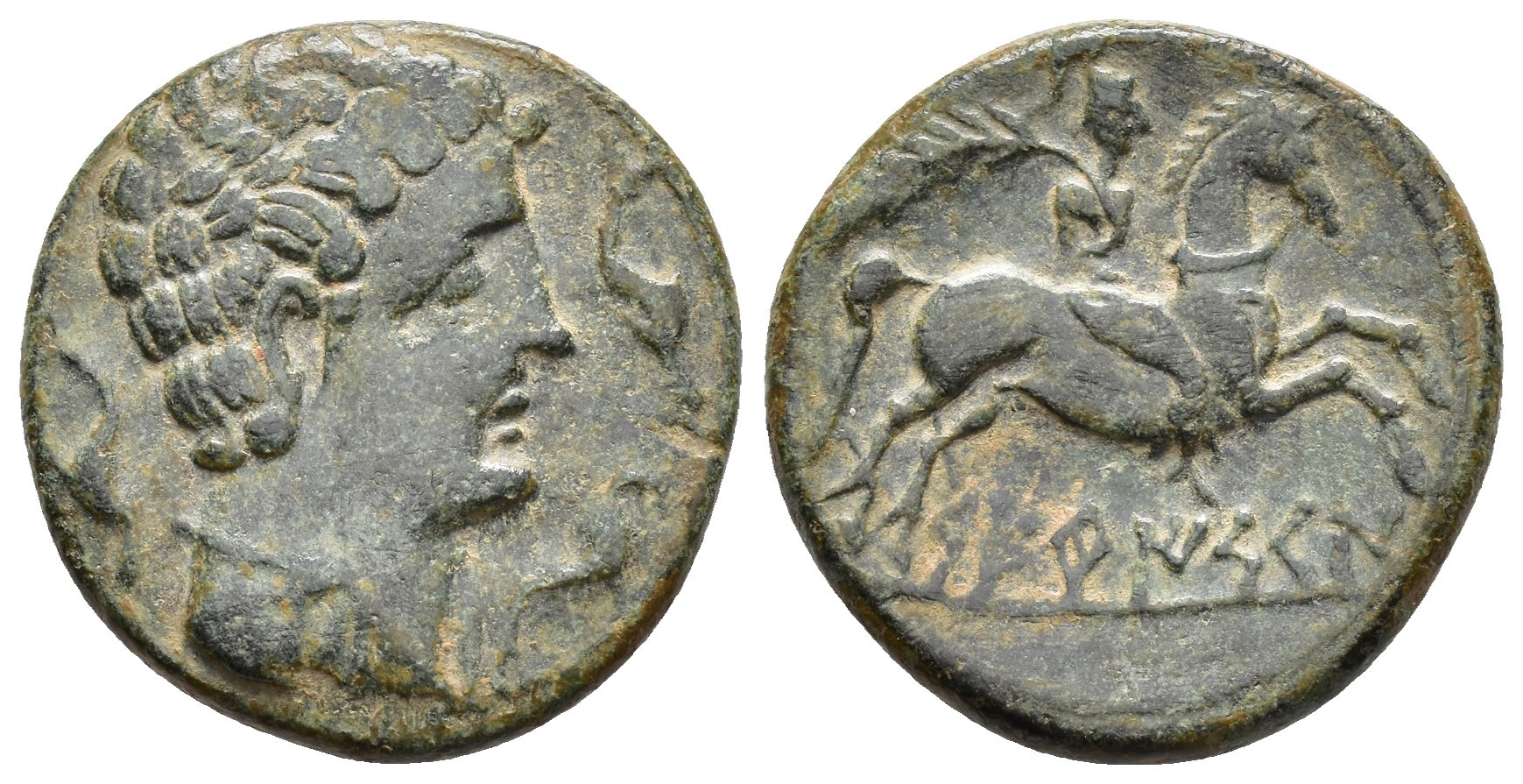 HISPANIA ANTIGUA. SETEISKEN. As. A/ Cabeza masculina a der., alrededor 3 delfines. R/ Jinete con palma a der., debajo sobre línea SETeISKeN. AE 8,09 g. 23,6 mm. I-2207; ACIP-1462. Pátina verde. MBC.