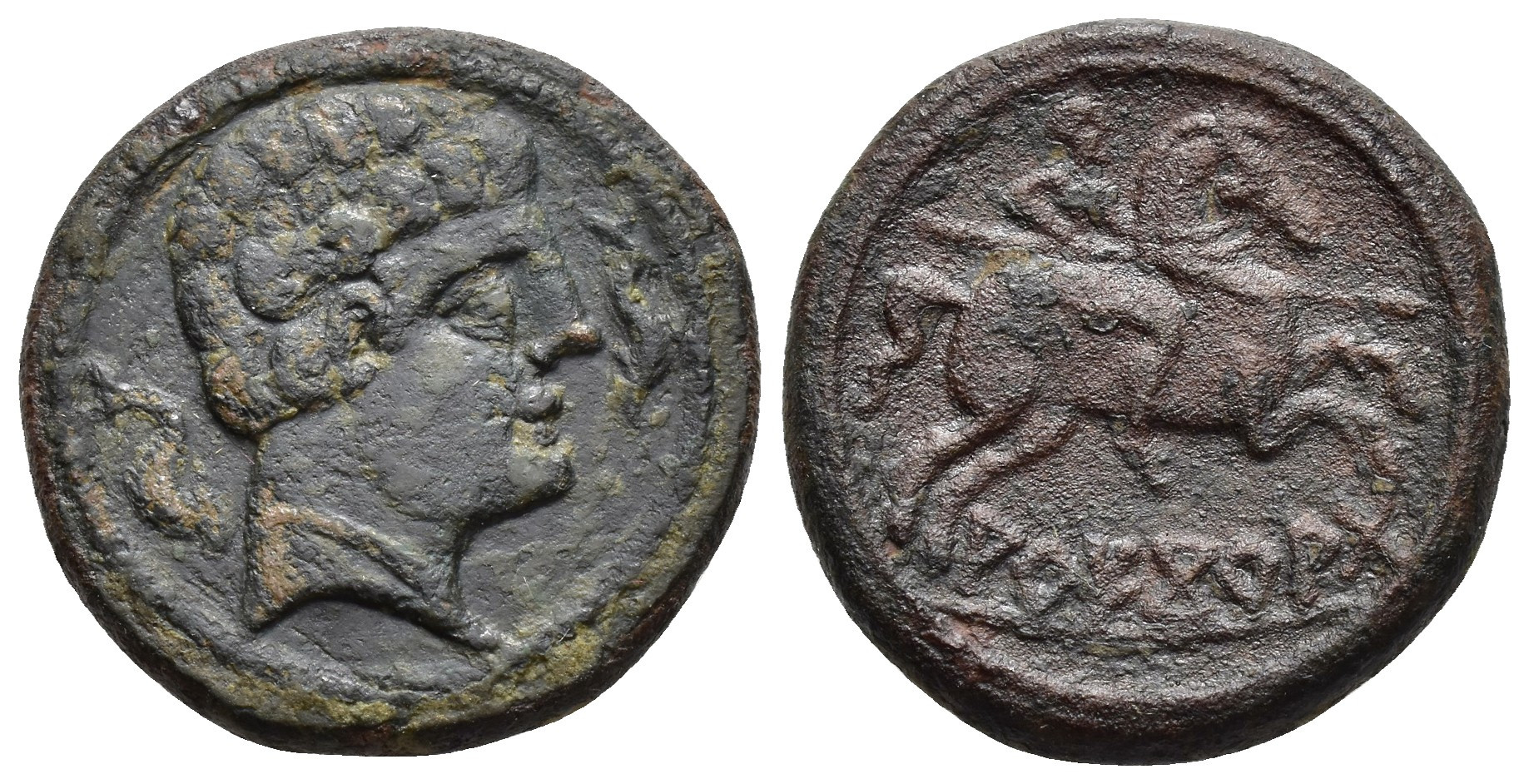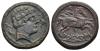 HISPANIA ANTIGUA. AREKORATA. Unidad . A/Cabeza masculina a der., delante y detrás delfín. R/Jinete con lanza a der., debjo sobre línea AREKoRATa. AE 10,69 g. 24,85 mm. I-116; ACIP-1777. Pátina rugosa, oscura en anv. y rojiza en rev. MBC/MBC-. Muy escasa.