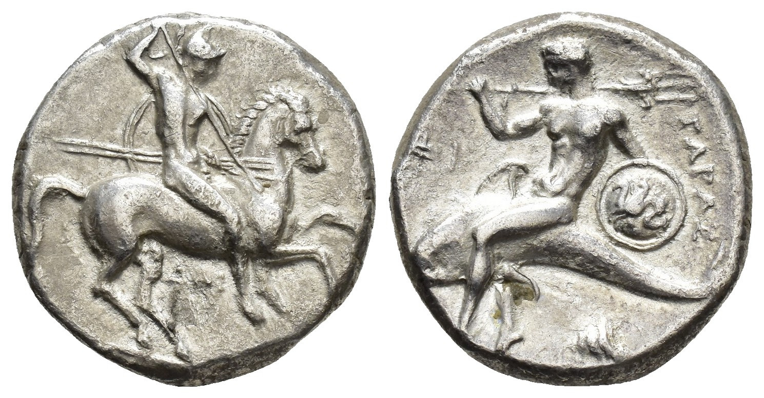 GRECIA ANTIGUA. CALABRIA. TARENTO. Didracma (334-302 a.C.). A/ Jinete con lanza a der., debajo DAI. R/ Taras cabalgando delfín a izq. con tridente y escudo, delante FI, detrás TARAS, debajo concha de múrex. AR 7,8 g. 18,6 mm. COP-845; SBG-345 vte. MBC+.