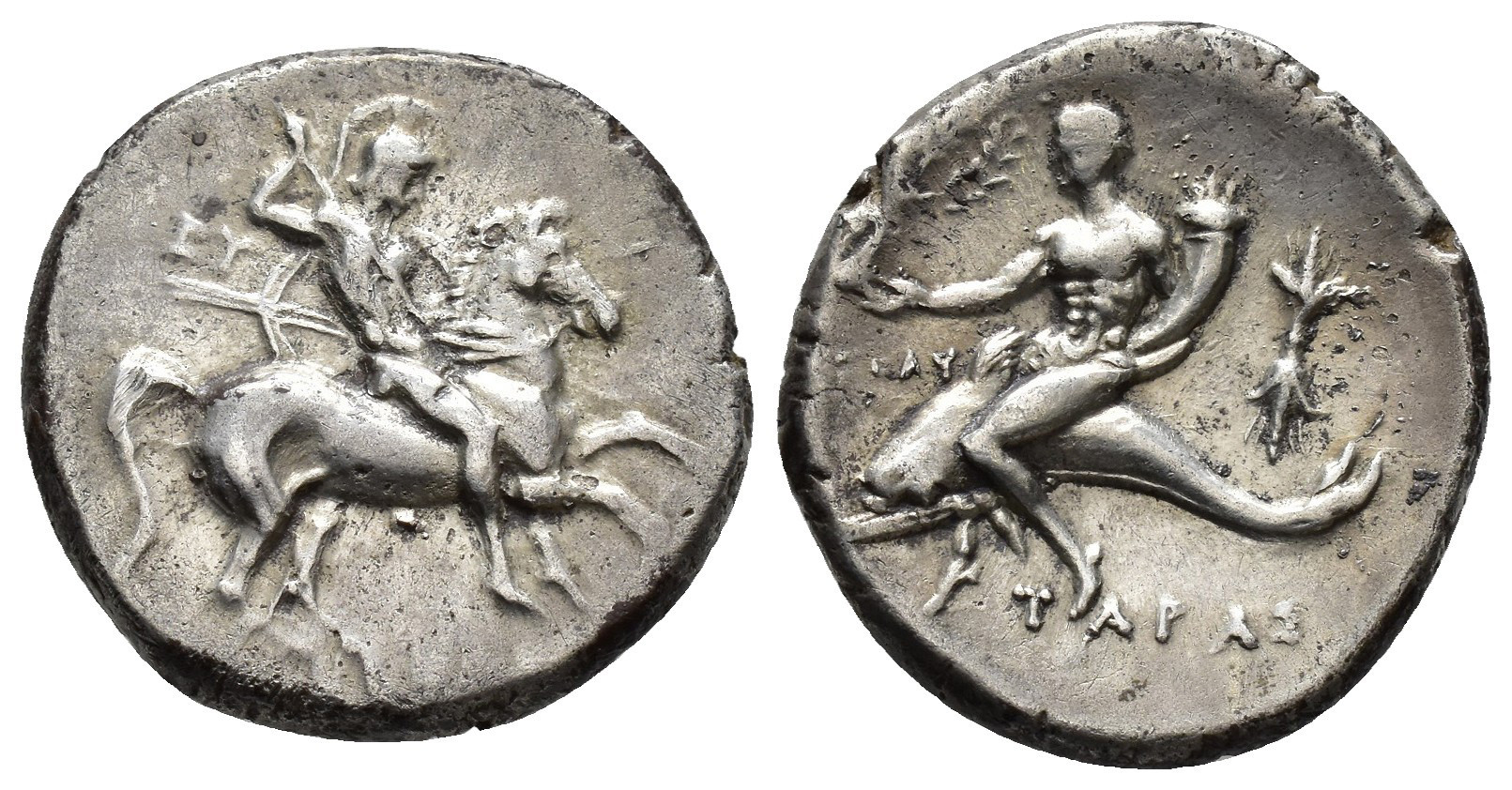 GRECIA ANTIGUA. CALABRIA. TARENTO. Didracma (c. 281-272 a.C.). A/ Jinete con lanza y escudo a der., detrás EY. R/ Taras cabalgando delfín a izq. con cornucopia y Niké. AR 6,37 g. 21,8 mm. COP-874 vte.; SBG-378 vte. MBC+.