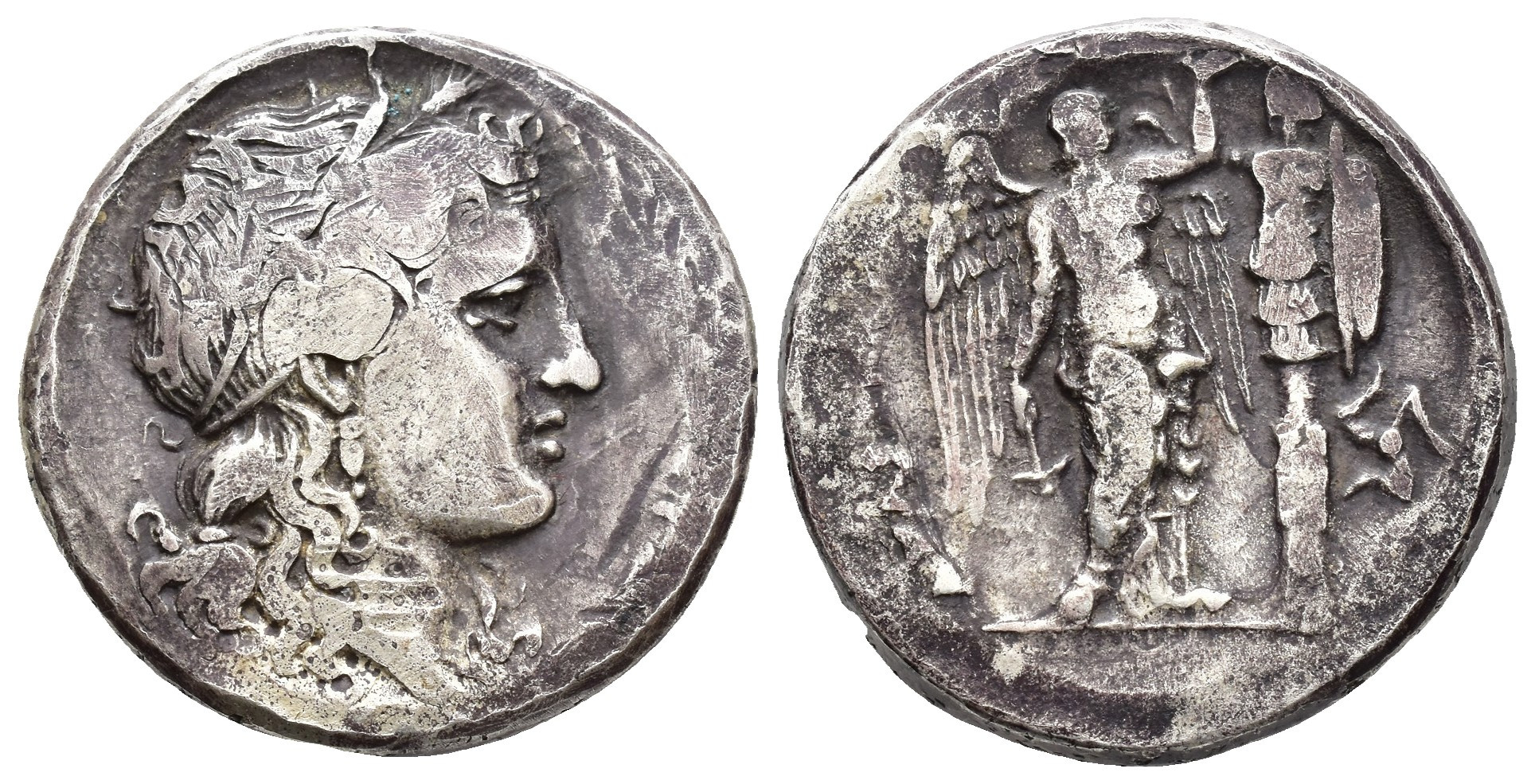 GRECIA ANTIGUA. SICILIA. Siracusa. Tetradracma. Época de Agatocles (310-304 a.C.). A/ Cabeza de Perséfone a der. R/ Niké a der. construyendo trofeo, en campo a der. trisqueles. AR 16,9 g. 25,4 mm. COP-764. Golpeada. BC+.