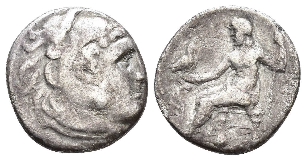 GRECIA ANTIGUA. MACEDONIA. Dracma. Alejandro III. A/ Cabeza de Herakles con leonté a der. R/ Zeus entronizado a izq. Símbolos no visibles. AR 3,95 g. 17,4 mm. Rayas en rev. MBC-.