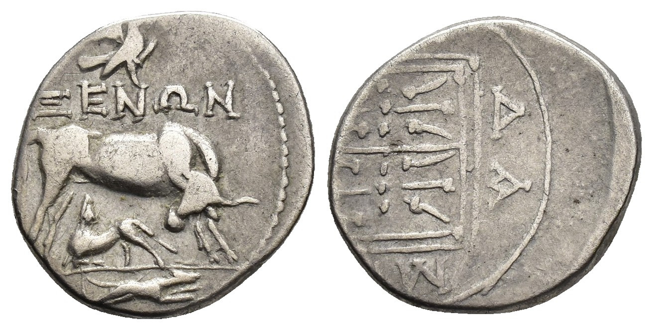GRECIA ANTIGUA. ILIRIA. Dirraquio. Dracma (c. 200-30 a.C.). A/ Vaca a der. amamantando ternero, encima águila, en exergo perro corriendo a der. R/ Cuadrado con doble diseño decorativo; [FILO]DA-M[OU]. AR 3,27 g. 16,9 mm. COP-no. Rev. descentrado. MBC-.