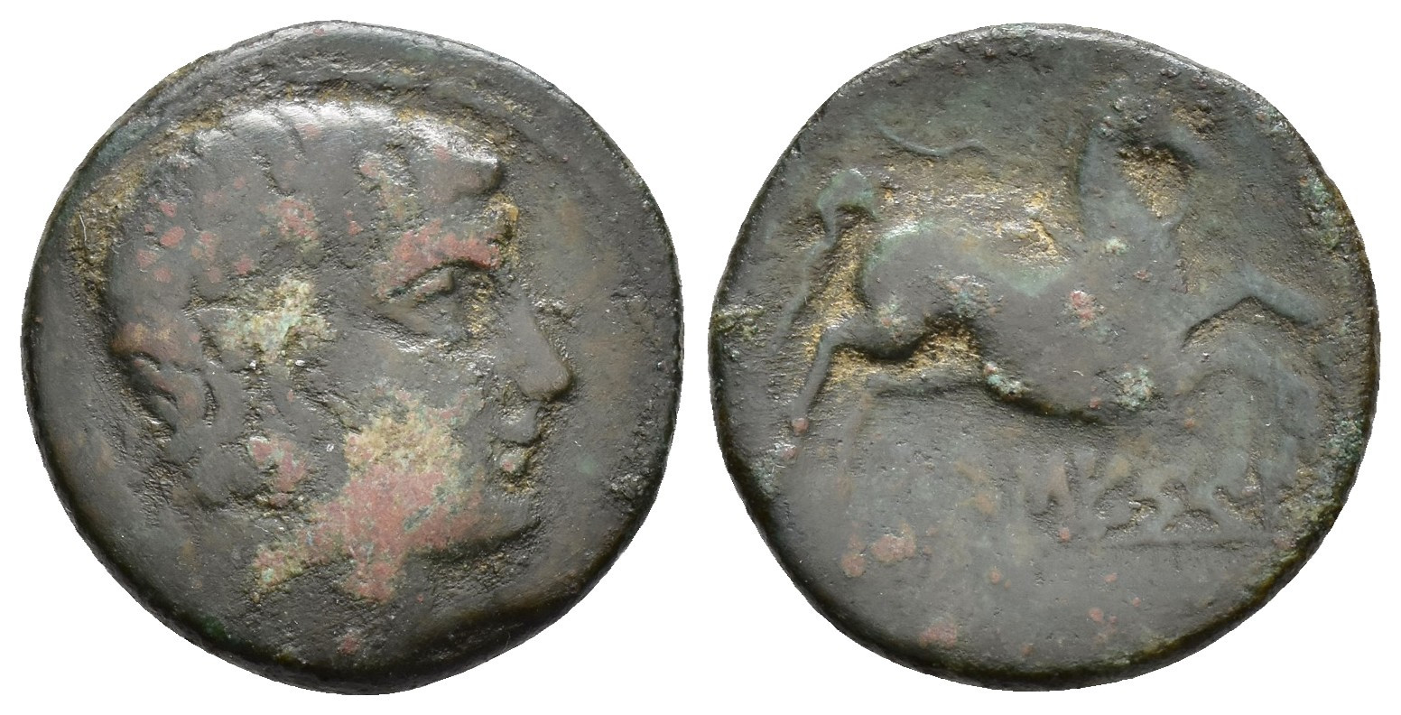 HISPANIA ANTIGUA. AUSESKEN. Mitad. A/ Cabeza masculina a der., detrás, jabalí. R/ Caballo galopando a der., debajo AUSESKeN. AE 5,84 g. 21,5 mm. I-172; ACIP-1302. CC-1402, mismo ejemplar. BC/BC-. Muy escasa.