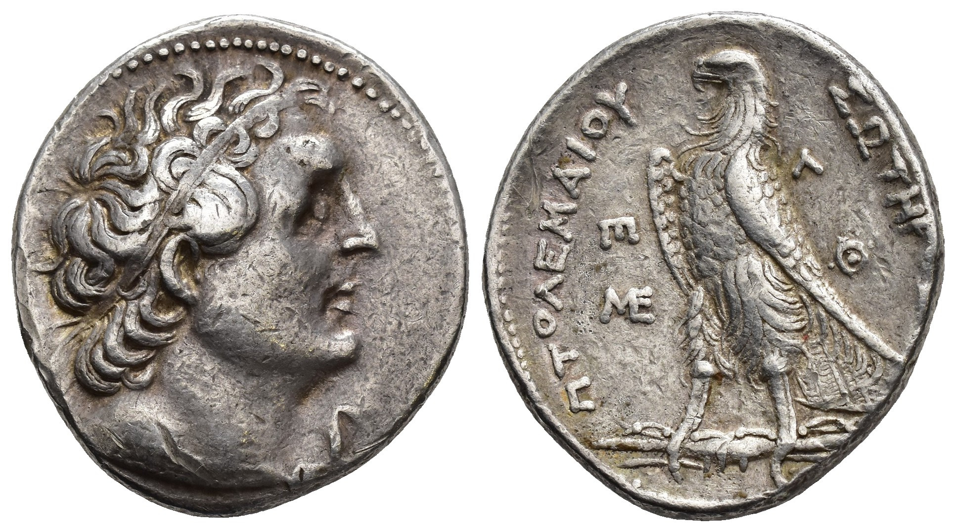 GRECIA ANTIGUA. REINO PTOLEMAICO. Tetradracma (Ptolomeo I). A/ Cabeza de Ptolomeo I diademada y con égida a der. R/ Águila a izq. Sobre haz de rayos, en campo a izq. y der. monogramas. AR 14,23 g. 28,3 mm. COP-87 ss. vte. monogr. MBC.