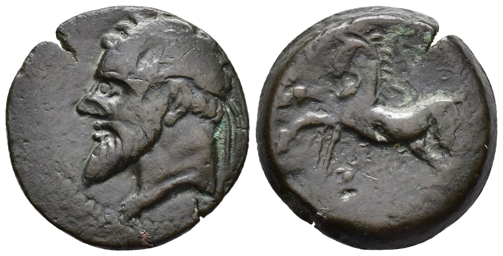 GRECIA ANTIGUA. NUMIDIA. AE (Massinisa o Micipsa). A/ Cabeza laureada a izq. R/ Caballo galopando a izq. AE 27,2 g. 15,5 mm. Cospel abierto. Golpes. MBC-/BC+.