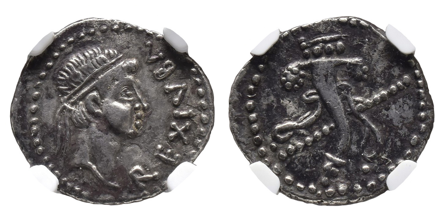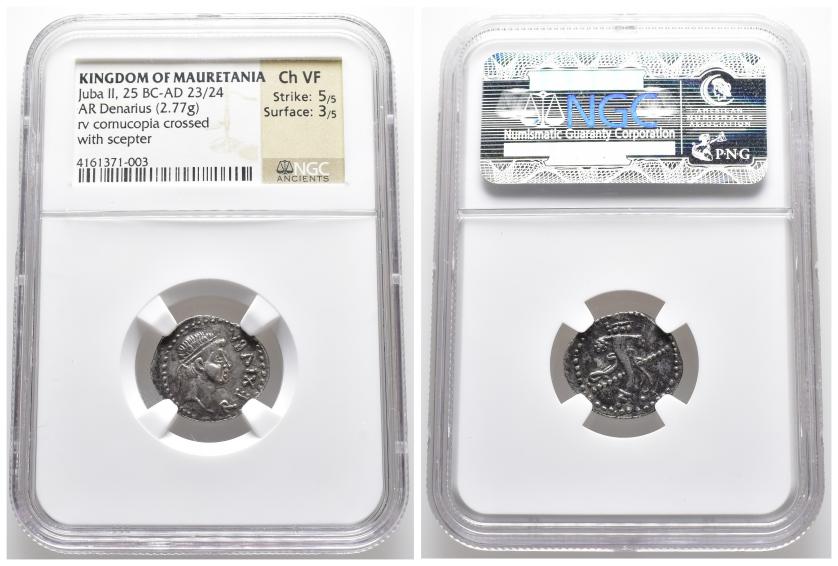 REYES NÚMIDAS Y MAURETANOS. JUBA II. Denario. Iol Caesarea. A/ Cabeza diademada a der.; REX IVBA. R/ Cornucopia con cetro cruzado. AR. COP-581; MAA-94. Encapsulada por NGC-Ch VF.
