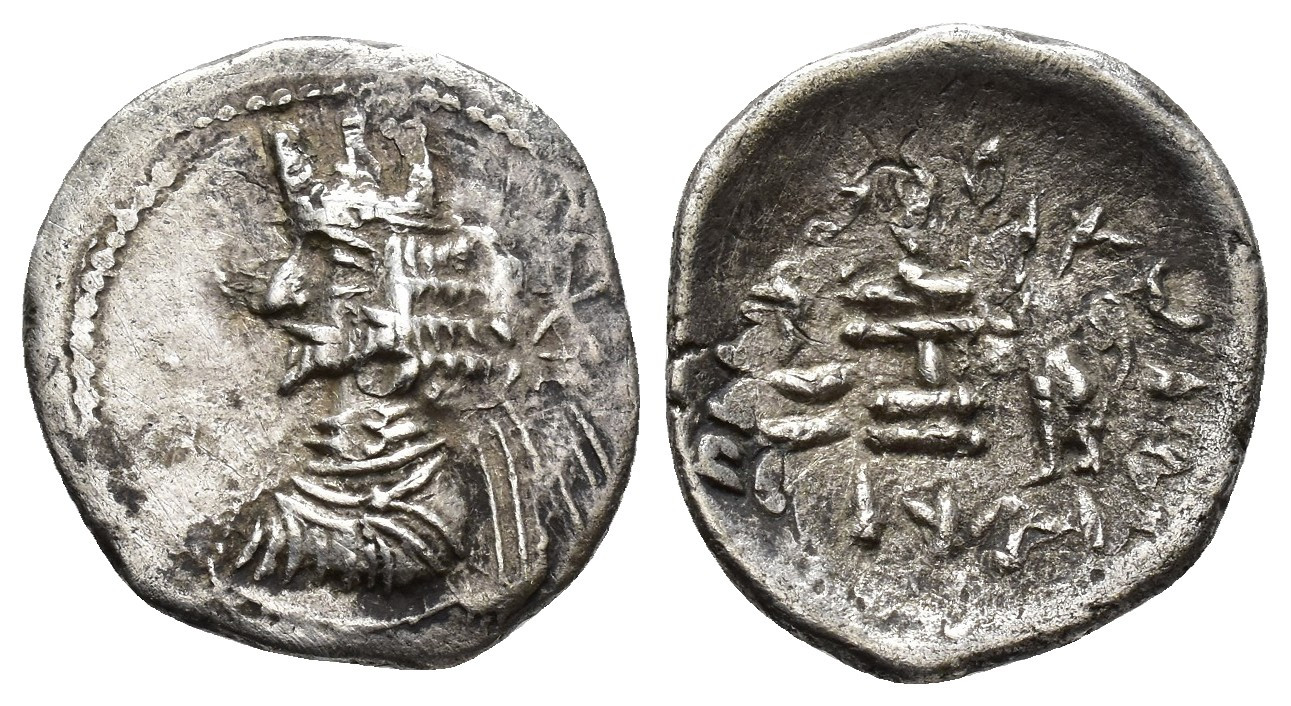 GRECIA ANTIGUA. PERSIS. Hemidracma (Artajerjes II (s. I a.C.). A/ Busto con corona mural a izq. R/ El rey a izq, ofrendando en altar. AR 1,97 g. 18,3 mm. Cop-297. Pequeñas marcas. MBC.