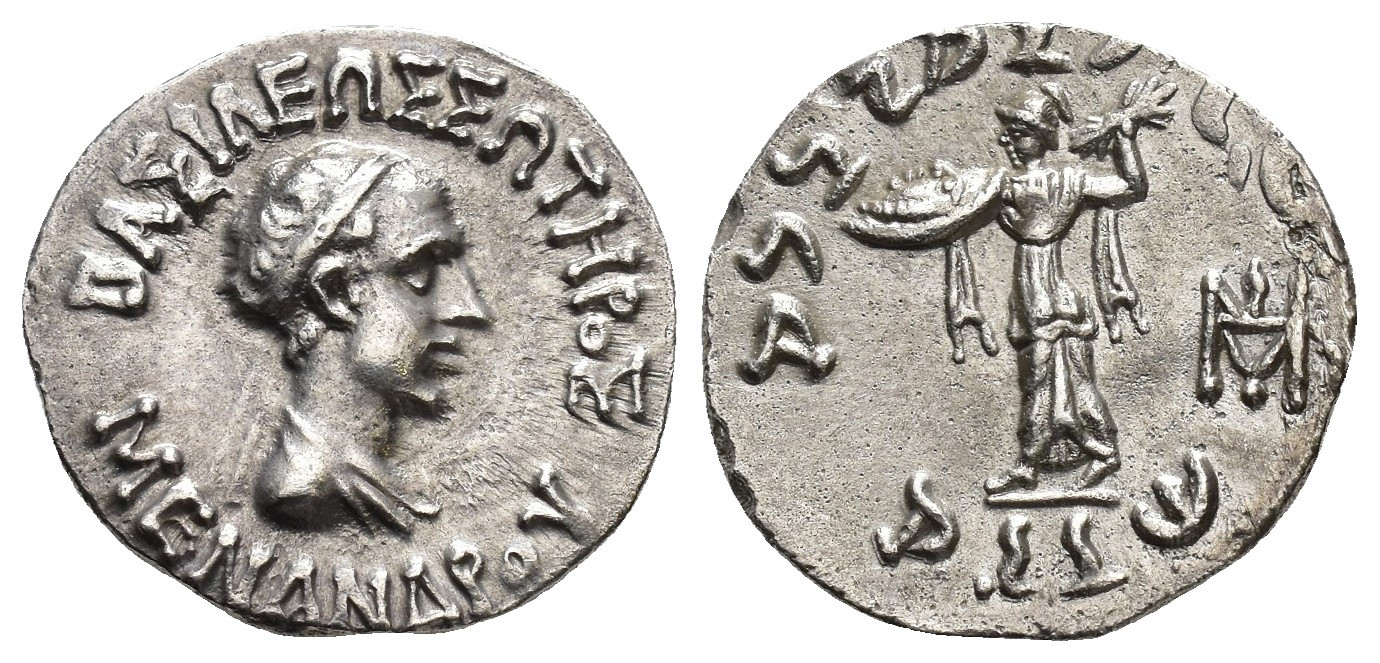 GRECIA ANTIGUA. BACTRIA. Dracma. Menandro I (160-145 a.C.). A/ Cabeza diademada y drapeada a der. R/ Palas a izq. con escudo y haz de rayos. AR 2,48 g. 17,2 mm. Mit.-215f. EBC-/EBC.