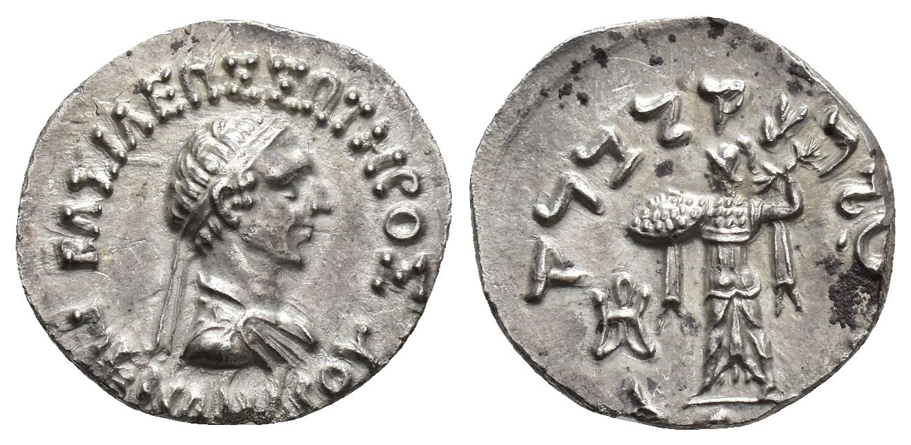 GRECIA ANTIGUA. BACTRIA. Dracma. Menandro I (160-145 a.C.). A/ Cabeza diademada y drapeada a der. R/ Palas a izq. con escudo y haz de rayos. AR 2,39 g. 16,7 mm. Mit-250o. Leve oxidación. EBC.