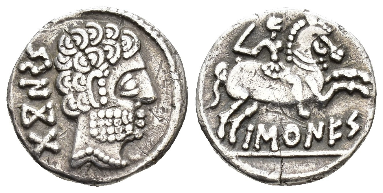 HISPANIA ANTIGUA. BASKUNES. Denario. A/ Cabeza masculina barbada a der., detrás BeNKoTa. R/ Jinete con espada a der., debajo sobre línea BaSKuNES. AR 3,8 g. 17,3 mm. I-215; ACIP-1630. Rayas y pequeña grieta. MBC.