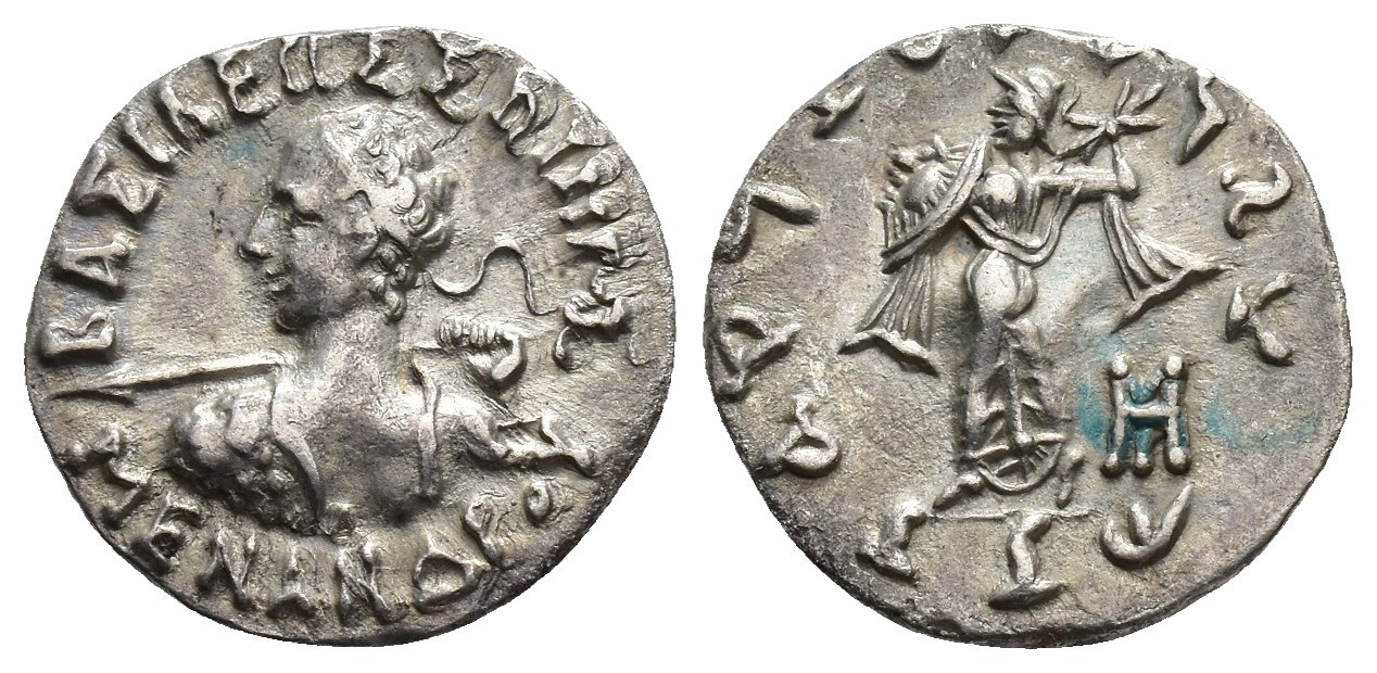 GRECIA ANTIGUA. BACTRIA. Dracma. Menandro I (160-145 a.C.). A/ Busto diademado con lanza a izq. R/ Palas a izq. con escudo y haz de rayos, detrás monograma. AR 2,42 g. 15,9 mm. Mit-224. MBC+/EBC-.