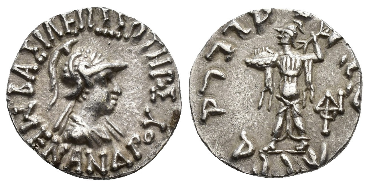 GRECIA ANTIGUA. BACTRIA. Dracma. Menandro I (155-130 a.C.). A/ Cabeza con casco a der. R/ Palas a izq. con escudo y haz de rayos, detrás monograma. AR 2,42 g. 16,9 mm. Mit.-218d. EBC-.