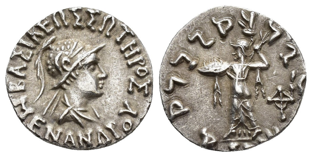 GRECIA ANTIGUA. BACTRIA. Dracma. Menandro I (155-130 a.C.). A/ Cabeza con casco a der. R/ Palas a izq. con escudo y haz de rayos, detrás monograma. AR 2,44 g. 16,6 mm. GC-7601. MBC+.
