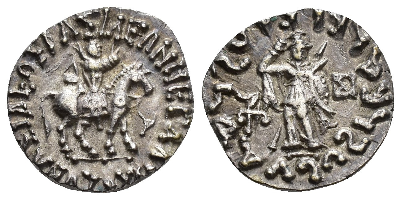 GRECIA ANTIGUA. BACTRIA-INDOESCITAS. Taxila. Dracma. Azes I (58-12 a.C.). A/ El rey a caballo a der., delante monograma. R/ Palas a der., delante y detrás monogramas. AR 2,43 g. 16,7 mm. MBC+.