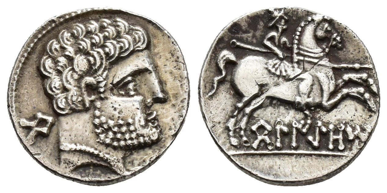 HISPANIA ANTIGUA. BELIKIOM. Denario. A/ Cabeza barbada y con collar a der., detrás Be. R/ Jinete lancero a der., debajo sobre línea BeLIKiOM. AR 3,03 g. 16,5 mm. I-241; ACIP-1432. Pequeñas erosiones. Limpieza mecánica. MBC+. Escasa.