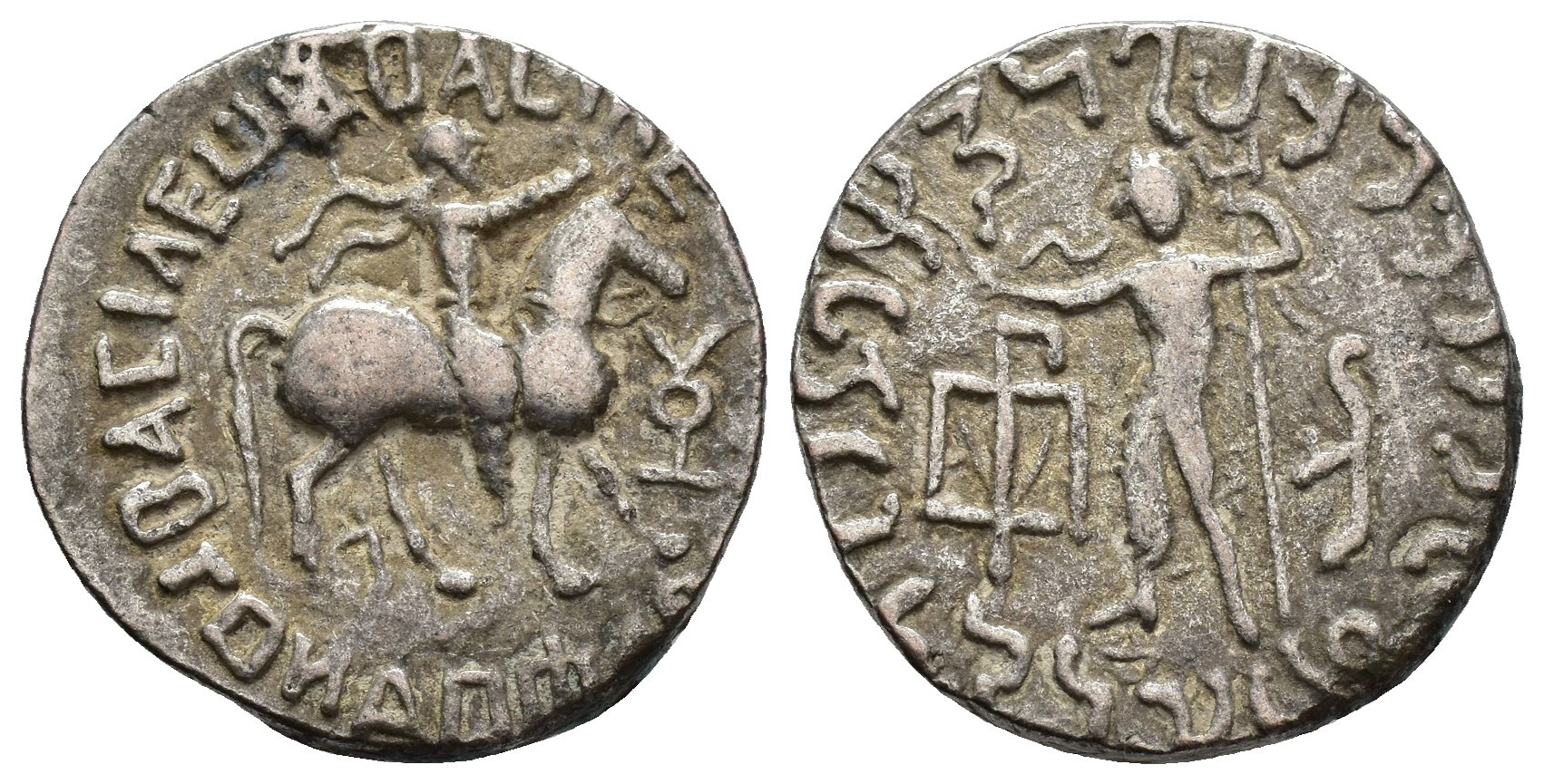 GRECIA ANTIGUA. BACTRIA-INDOESCITAS. Tetradracma. Gondofares (20-55 d.C.). A/ El rey a caballo a der., delante monograma. R/ Siva a izq., en campo monogramas. AR 9,49 g. 22,8 mm. MBC/MBC-.