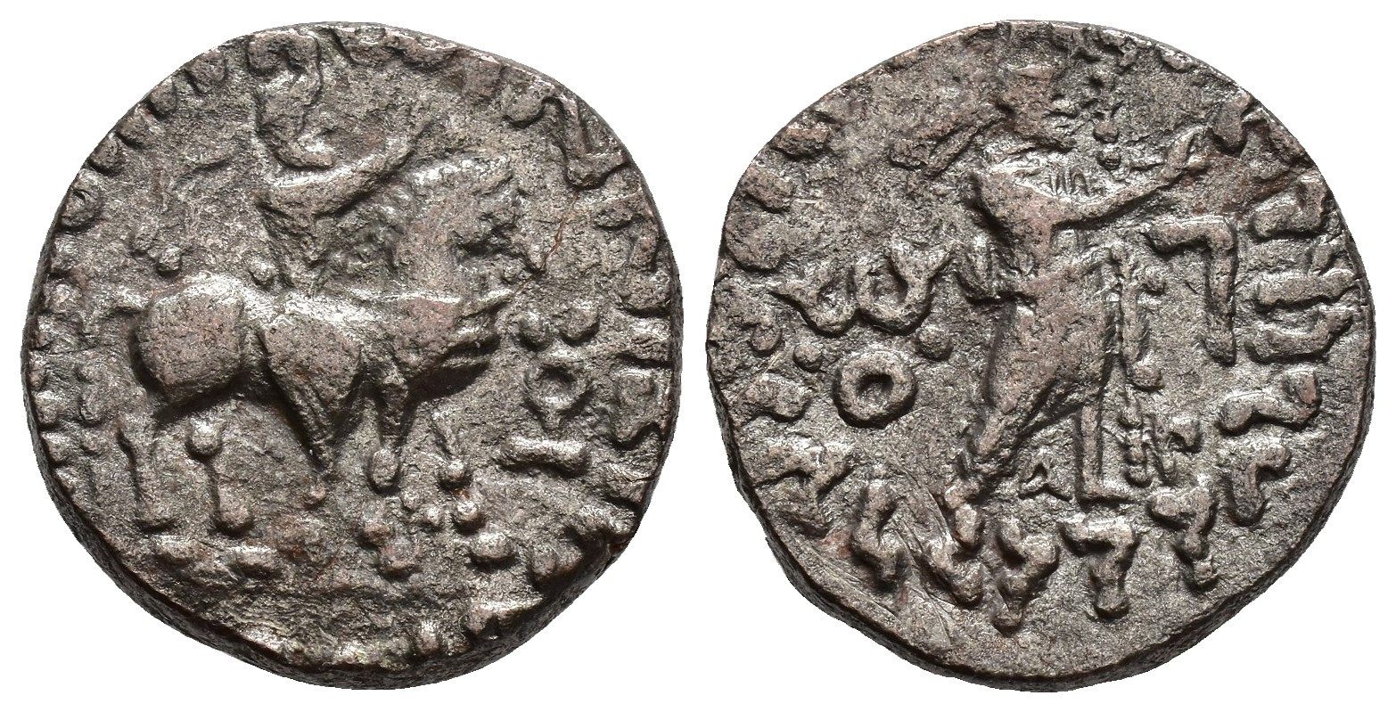 GRECIA ANTIGUA. BACTRIA-INDOESCITAS. Tetradracma. Sasan (35-55 d.C.). A/ El rey a caballo a der., delante monograma. R/ Zeus con cetro a der., monogramas. AR 9,69 g. 20,7 mm. MBC.